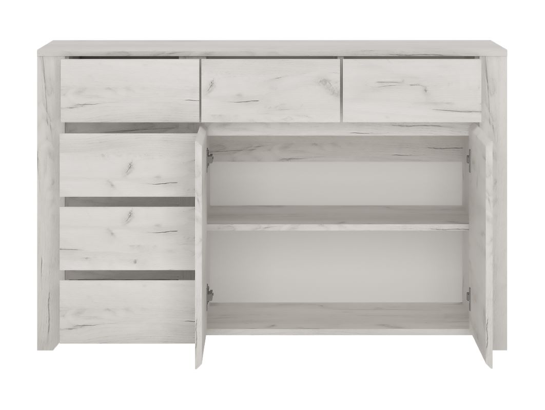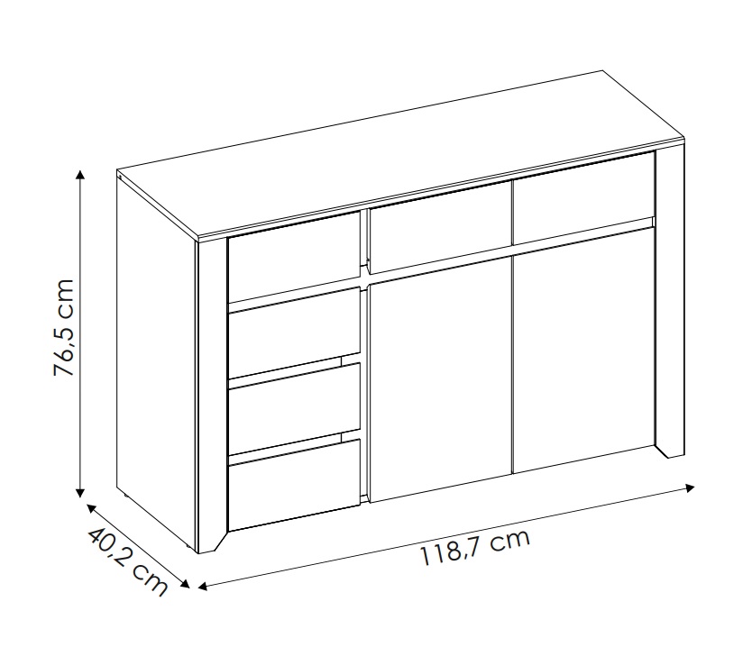 Komoda ma wymiary 118,7 cm szerokości, 76,5 cm wysokości i 40,2 cm głębokości. Wyposażona jest w dwie drzwi oraz sześć pojemnych szuflad, które umożliwiają wygodne segregowanie przedmiotów. System bezuchwytowy nadaje meblowi nowoczesny i minimalistyczny wygląd, a szuflady poruszają się płynnie dzięki prowadnicom rolkowym. Drzwi osadzono na zawiasach puszkowych, co zapewnia ciche i stabilne użytkowanie.