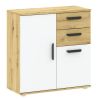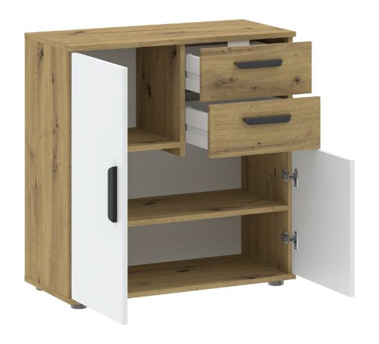Komoda Basic Two to połączenie funkcjonalności i nowoczesnego designu, które doskonale sprawdzi się w salonie, sypialni lub przedpokoju. Wykończenie w dekorze dąb artisan nadaje meblowi ciepłego, naturalnego charakteru, a matowe białe fronty dodają elegancji i lekkości.
