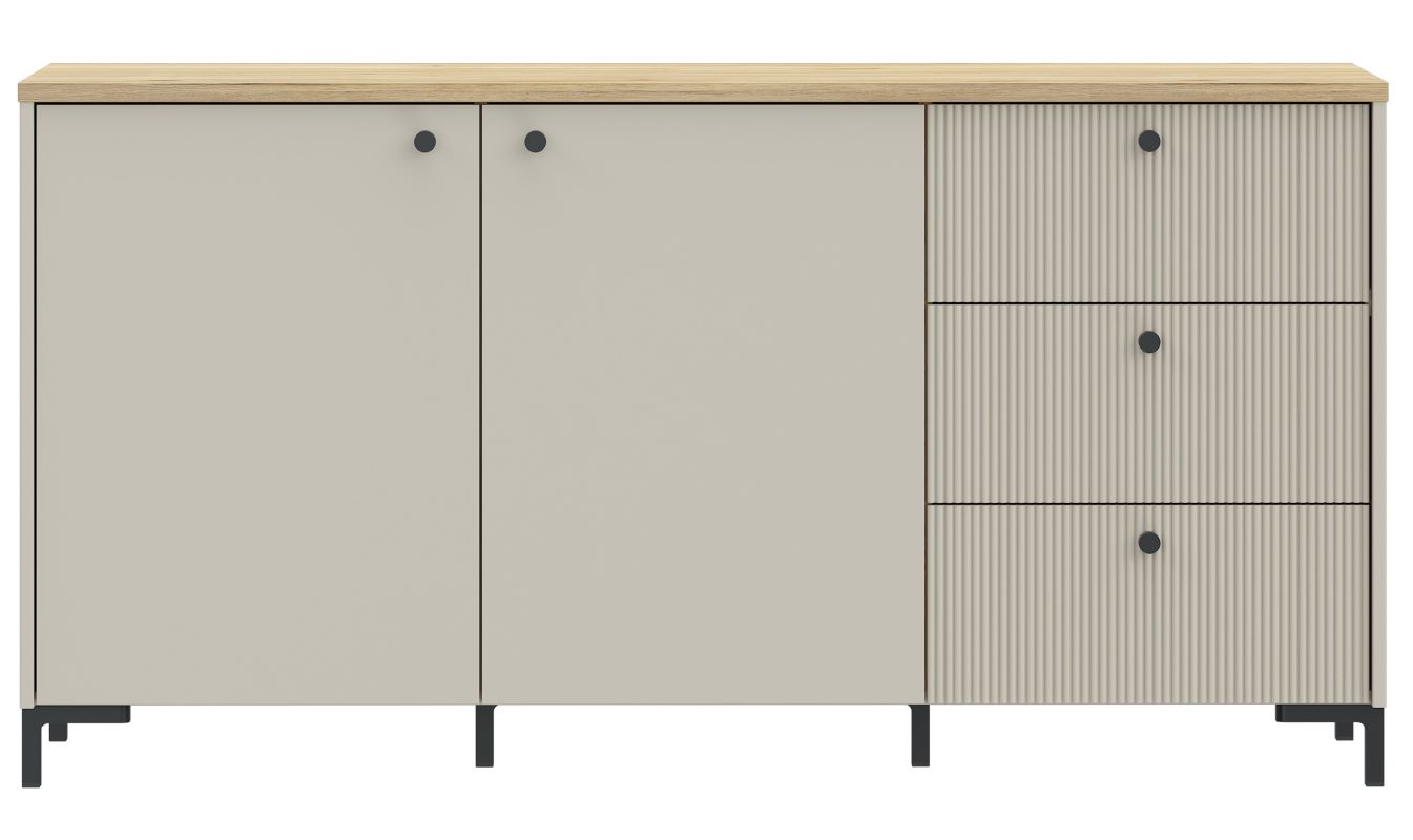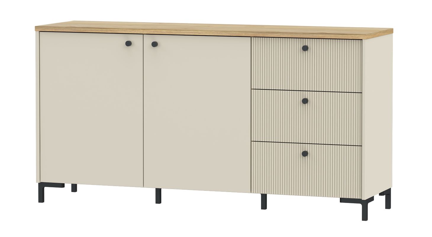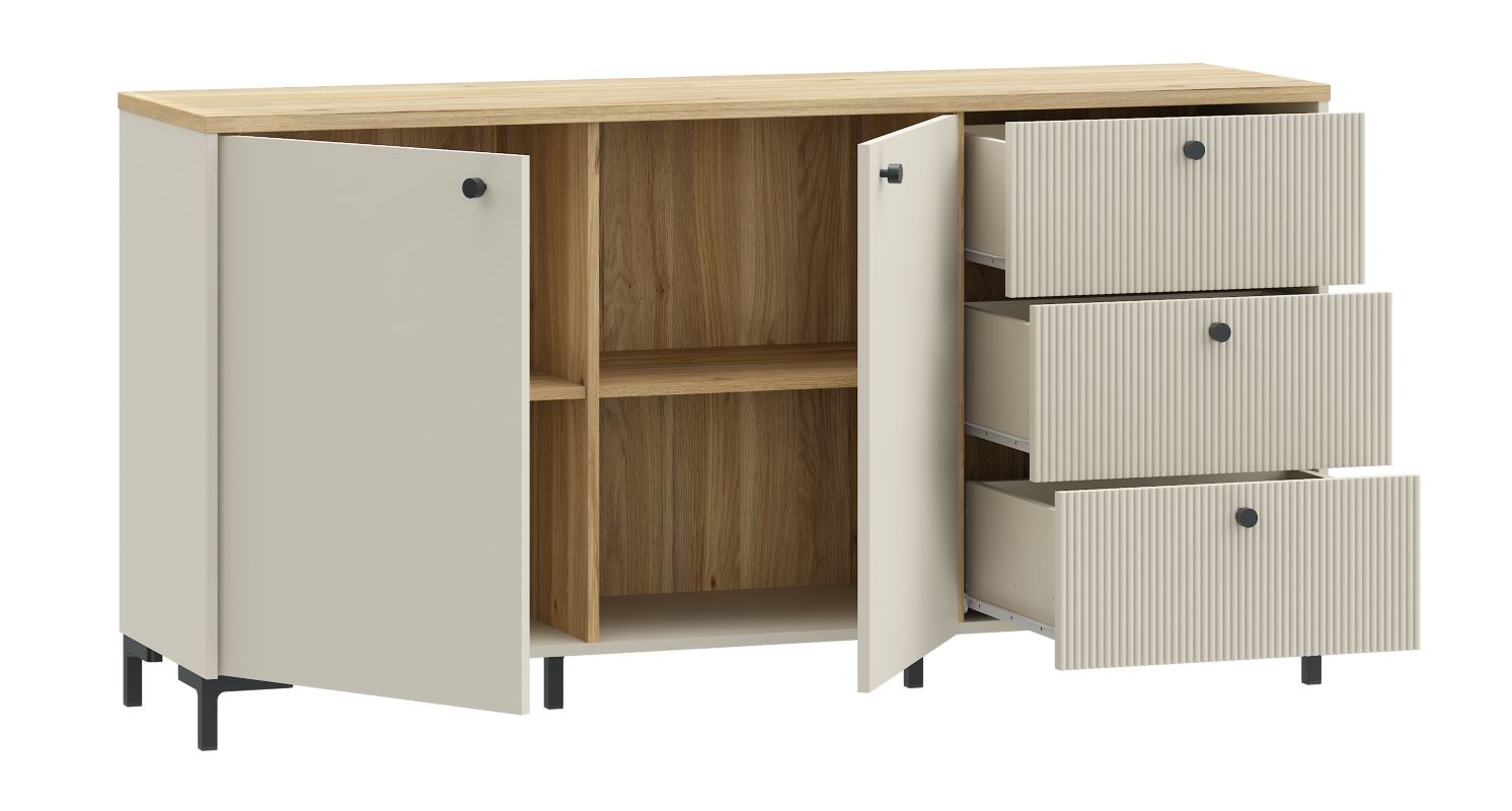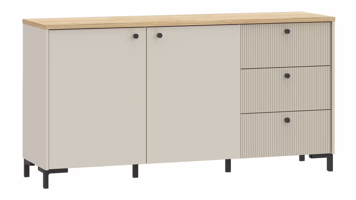Wyjątkowy charakter mebla podkreślają fronty z ryflowanego MDF-u, nadające mu nowoczesnego, a zarazem subtelnego wyglądu. Dwie zamykane szafki kryją dwie pojemne półki, idealne na książki, dokumenty czy inne przedmioty. Dodatkowo, trzy szuflady z prowadnicami o pełnym wysuwie gwarantują wygodne przechowywanie drobniejszych rzeczy, zapewniając łatwy dostęp do ich zawartości.