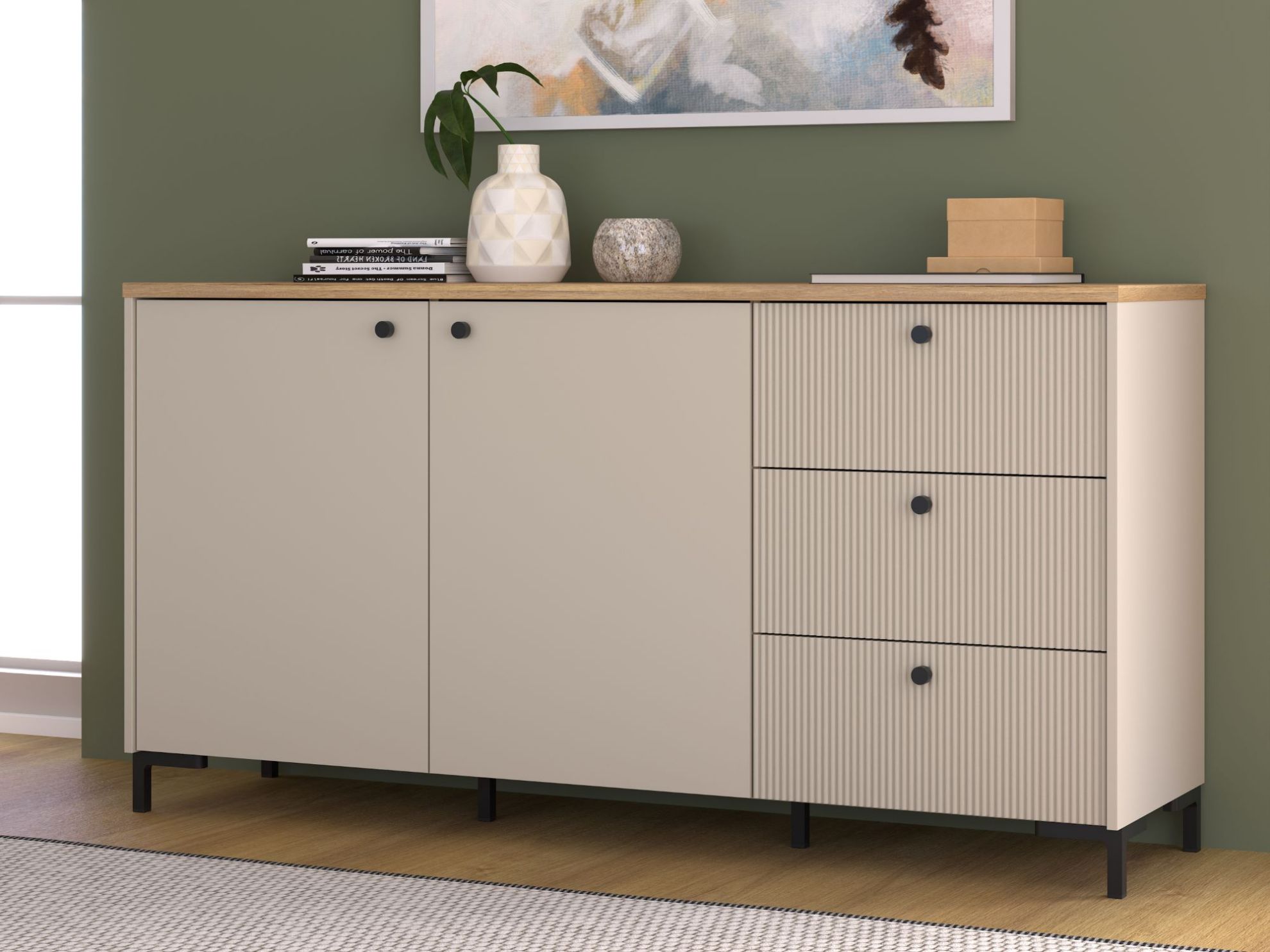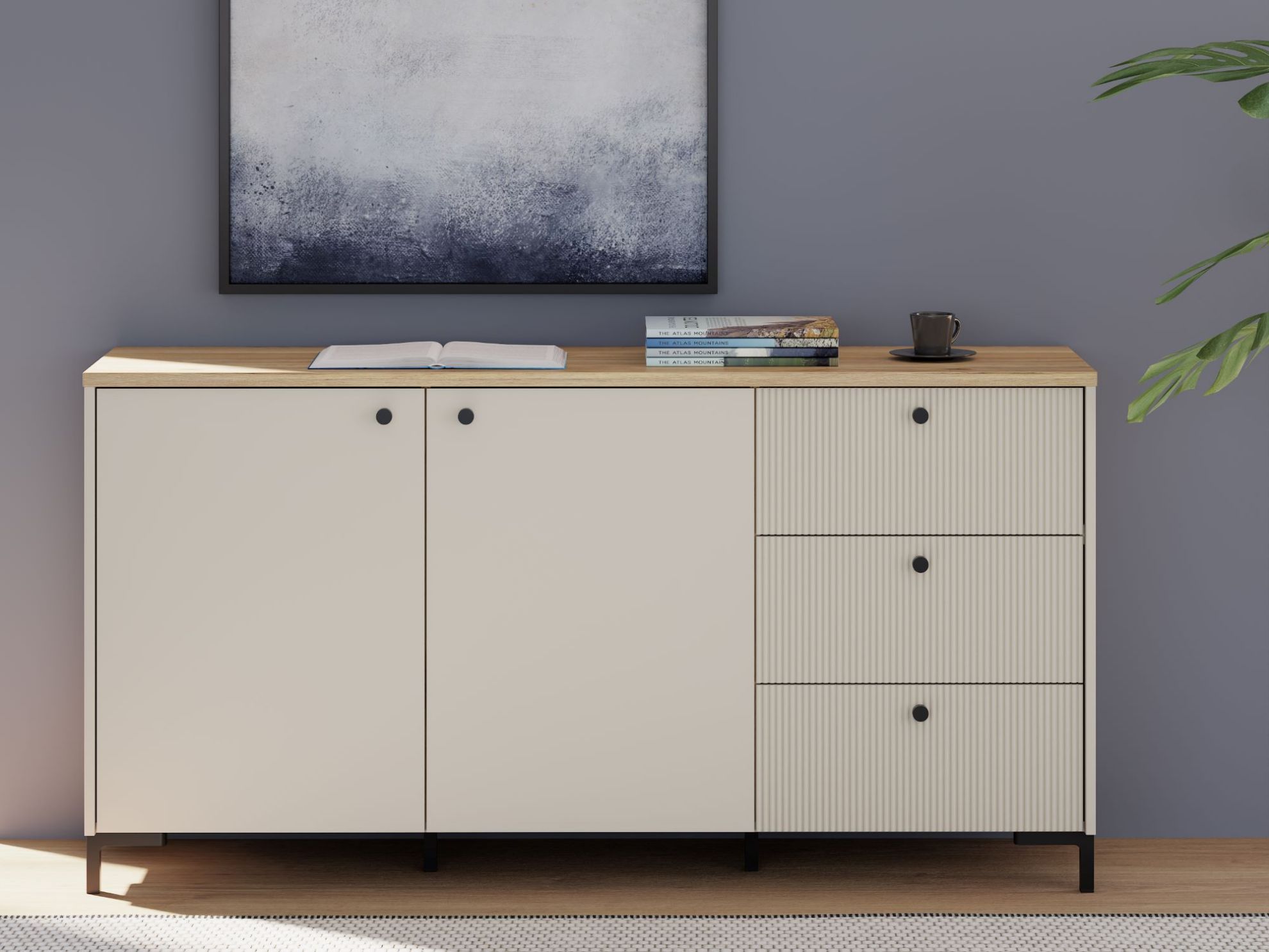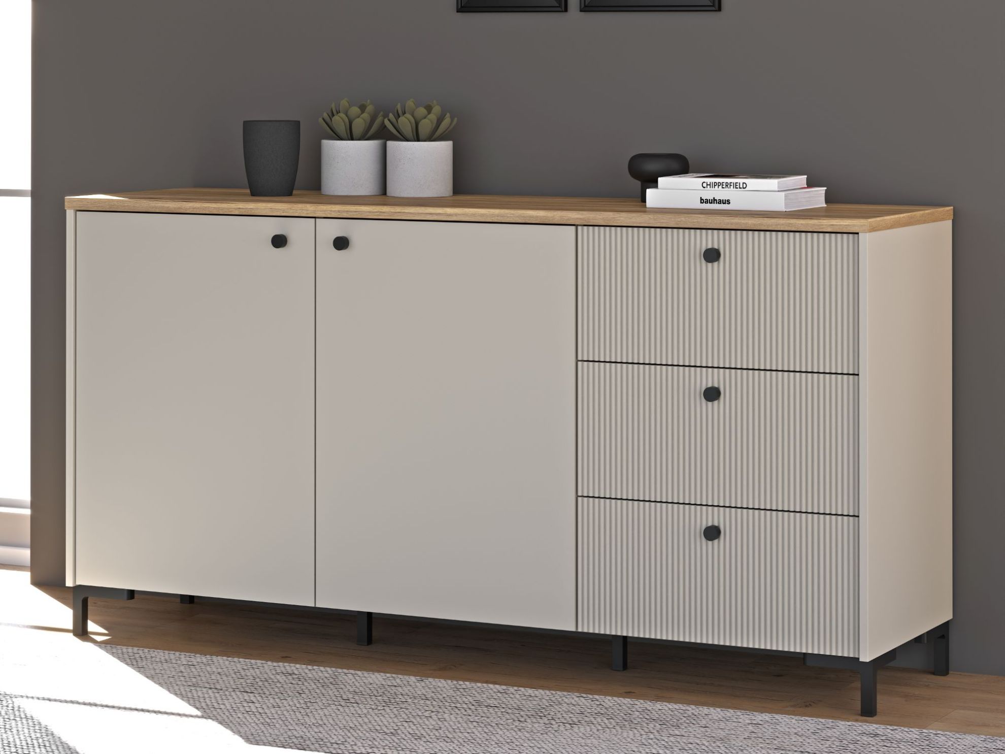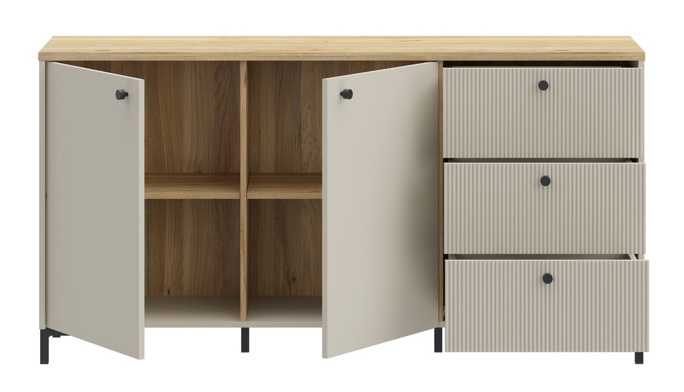 Wyjątkowy charakter mebla podkreślają fronty z ryflowanego MDF-u, nadające mu nowoczesnego, a zarazem subtelnego wyglądu. Dwie zamykane szafki kryją dwie pojemne półki, idealne na książki, dokumenty czy inne przedmioty. Dodatkowo, trzy szuflady z prowadnicami o pełnym wysuwie gwarantują wygodne przechowywanie drobniejszych rzeczy, zapewniając łatwy dostęp do ich zawartości.