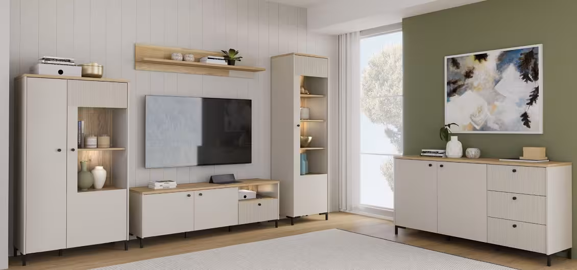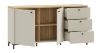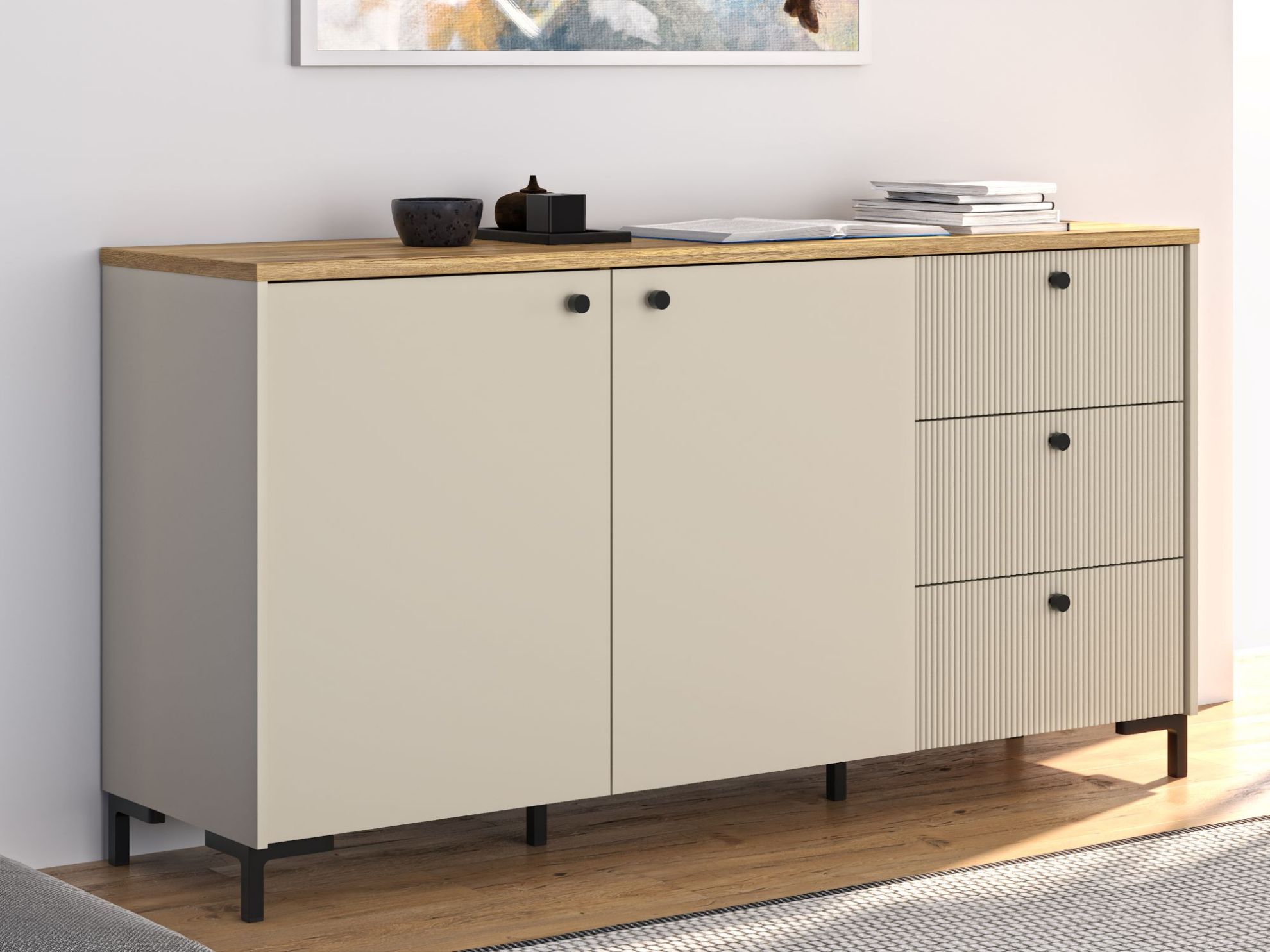 Wyjątkowy charakter mebla podkreślają fronty z ryflowanego MDF-u, nadające mu nowoczesnego, a zarazem subtelnego wyglądu. Dwie zamykane szafki kryją dwie pojemne półki, idealne na książki, dokumenty czy inne przedmioty. Dodatkowo, trzy szuflady z prowadnicami o pełnym wysuwie gwarantują wygodne przechowywanie drobniejszych rzeczy, zapewniając łatwy dostęp do ich zawartości.