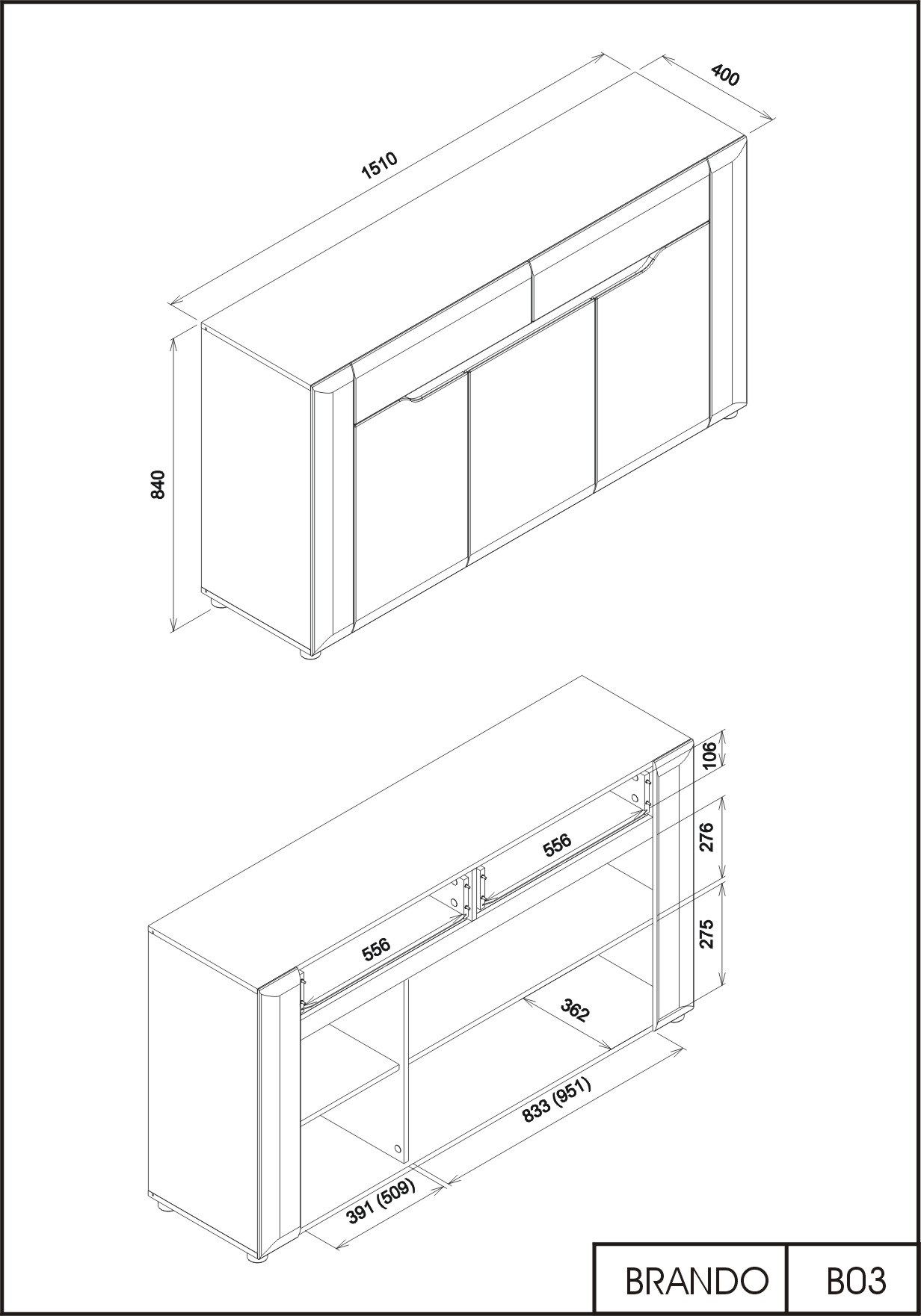 Komoda Brando B03 wpasuje się w niemal każdą aranżację. Ociepli wizerunek pomieszczenia, w którym się znajduje. Idealna zarówno do dużych jak i mniejszych pomieszczeń, sprawdzi się w pokoju dziennym, garderobie, jak i w sypialni. Komoda posiada dwie pojemne szuflady oraz troje drzwi, za którymi ukryto po jednej półce dzielącej każdą komorę na dwie części. Pojemne wnętrze pozwoli na przechowanie dużej ilości przedmiotów niezbędnych w każdym domu, a na szerokim blacie można ustawić ozdoby dekoracyjne i pamiątki. Nowoczesny wygląd komody zapewniają frezowane fronty, które pełnią rolę uchwytów do otwierania. Uniwersalny wygląd mebla komponuje się z innymi kolorami, co pozwoli na nieograniczone możliwości aranżacyjne. Komoda idealnie sprawdzi się w kompozycji z półką B-8 oraz innymi bryłami z serii BRANDO lub jako pojedynczy mebel, który można dopasować do własnej aranżacji pomieszczenia.