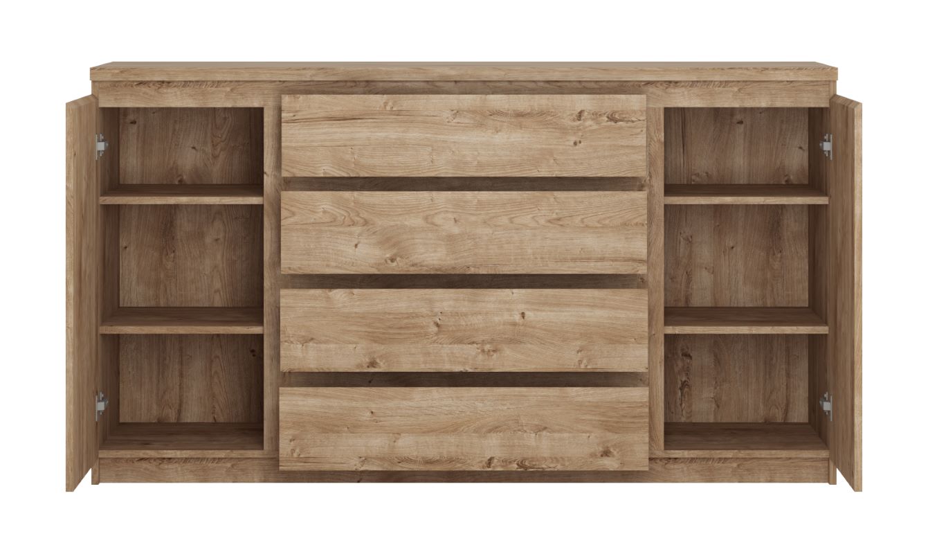 Komoda dwudrzwiowa z szufladami FRIK03 to uniwersalny mebel, który świetnie sprawdzi się zarówno w salonie, jak i jadalni. Wyposażona w cztery pojemne szuflady z systemem pełnego wysuwu oraz półki za frontami, pozwala na wygodne przechowywanie zastawy stołowej, tekstyliów czy dokumentów.