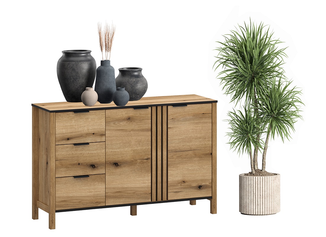 Czarne wykończenia blatu oraz metalowe uchwyty w kolorze czarnym nadają komodzie wyjątkowego, nowoczesnego charakteru. Komoda dwudrzwiowa z trzema szufladami to praktyczne rozwiązanie dla tych, którzy poszukują mebla, który połączy funkcję przechowywania z estetyką.
