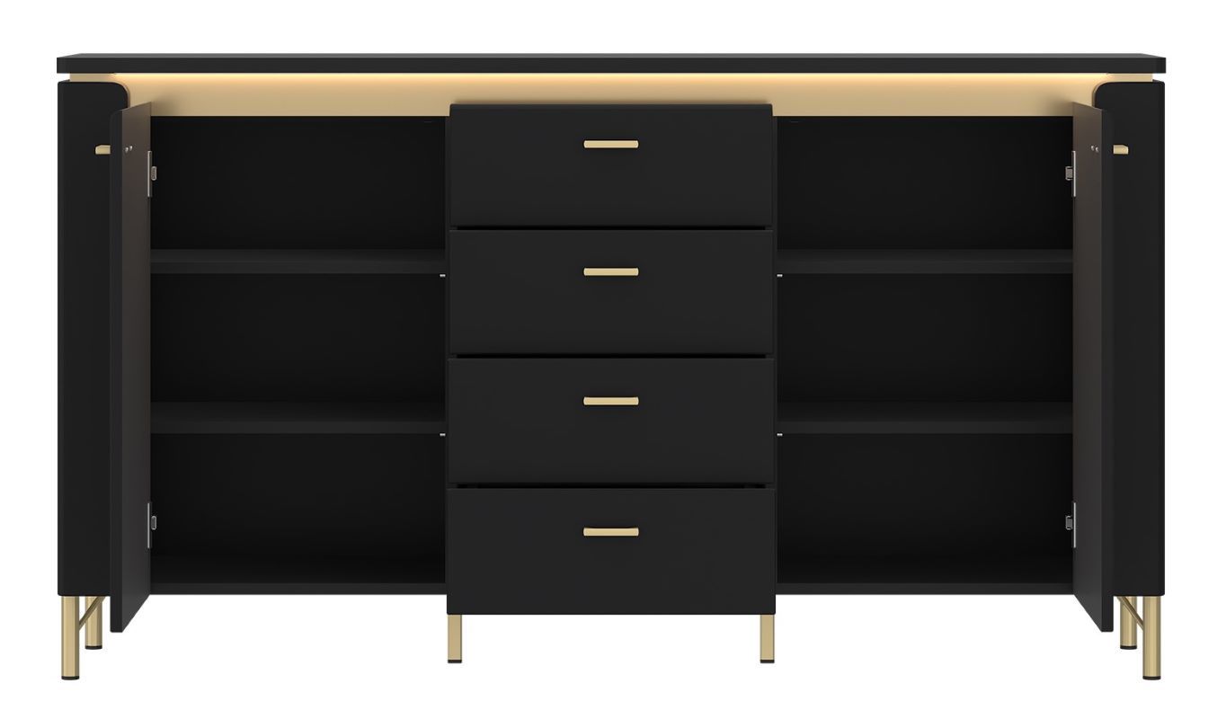 Matowe, czarne wykończenie frontów i korpusu idealnie współgra z metalowymi uchwytami oraz wysokimi nóżkami w kolorze złota, tworząc wyrafinowaną kompozycję. Złote elementy dodają wnętrzu subtelnego blasku, a jednocześnie podkreślają nowoczesny charakter mebla. Podwyższone nóżki nadają konstrukcji lekkości, a dodatkowo ułatwiają utrzymanie czystości pod komodą.