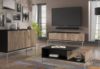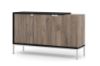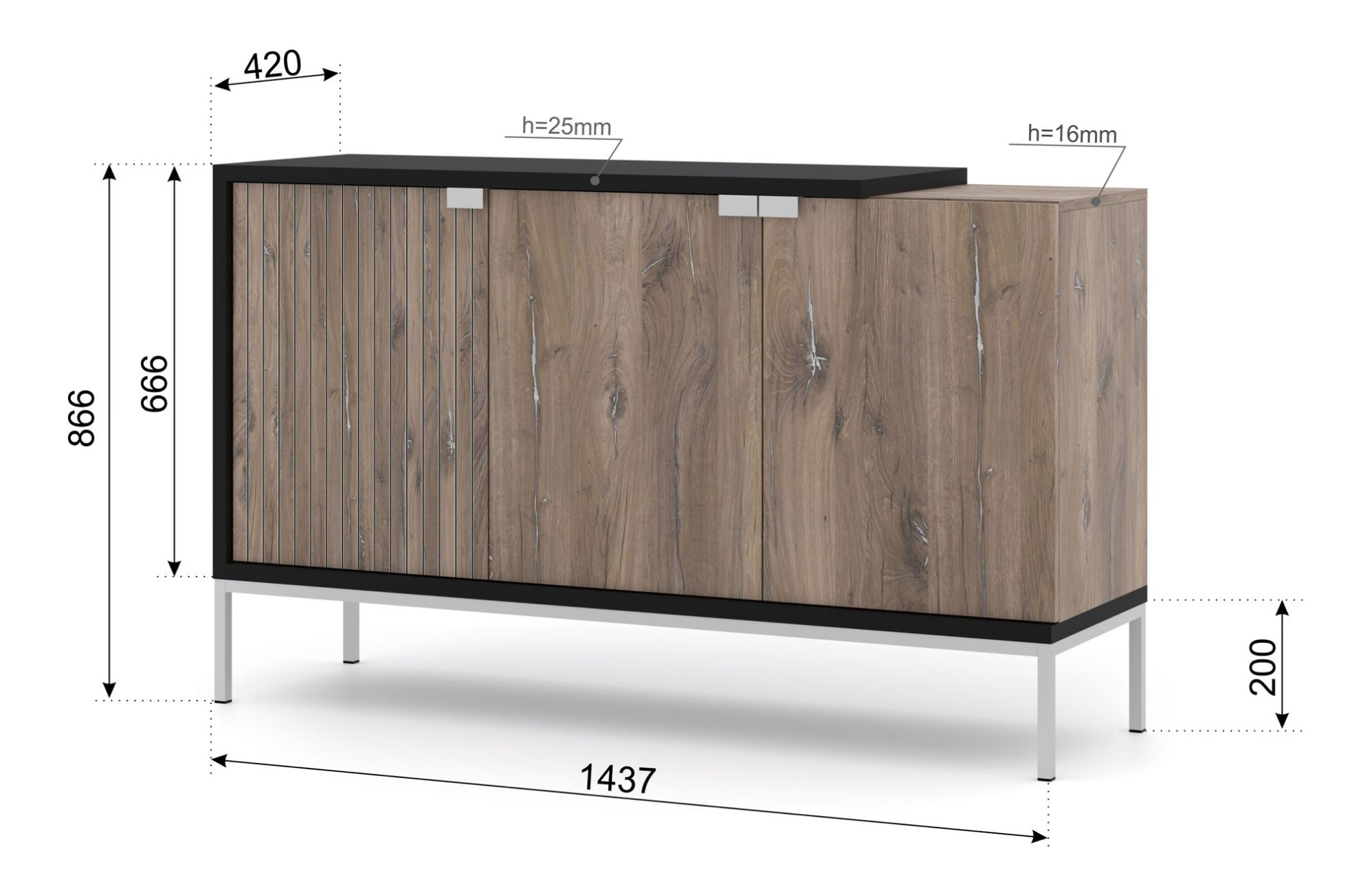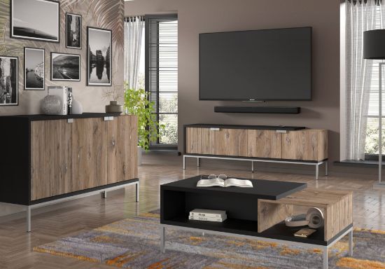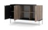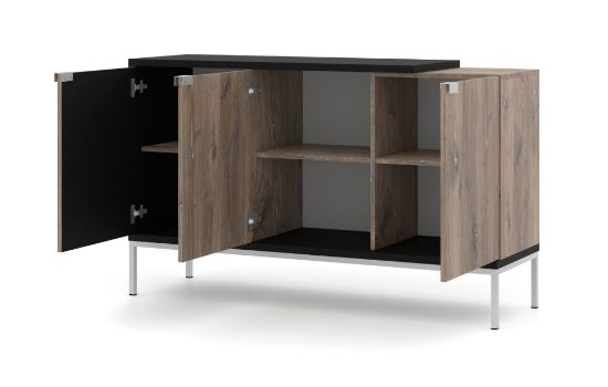 Korpus komody został wykonany z solidnej płyty laminowanej o grubości 16 mm w kolorze dębu Flagstaff, co nadaje meblowi naturalny i ciepły wygląd oraz z płyty laminowanej o grubości 25 mm w kolorze czarnym. Fronty z płyty MDF o grubości 16 mm dodają ozdobnego elementu, tworząc interesujący kontrast kolorystyczny. Nóżki i uchwyty z metalu w kolorze srebrnym dopełniają całość, nadając komodzie nowoczesnego wykończenia.