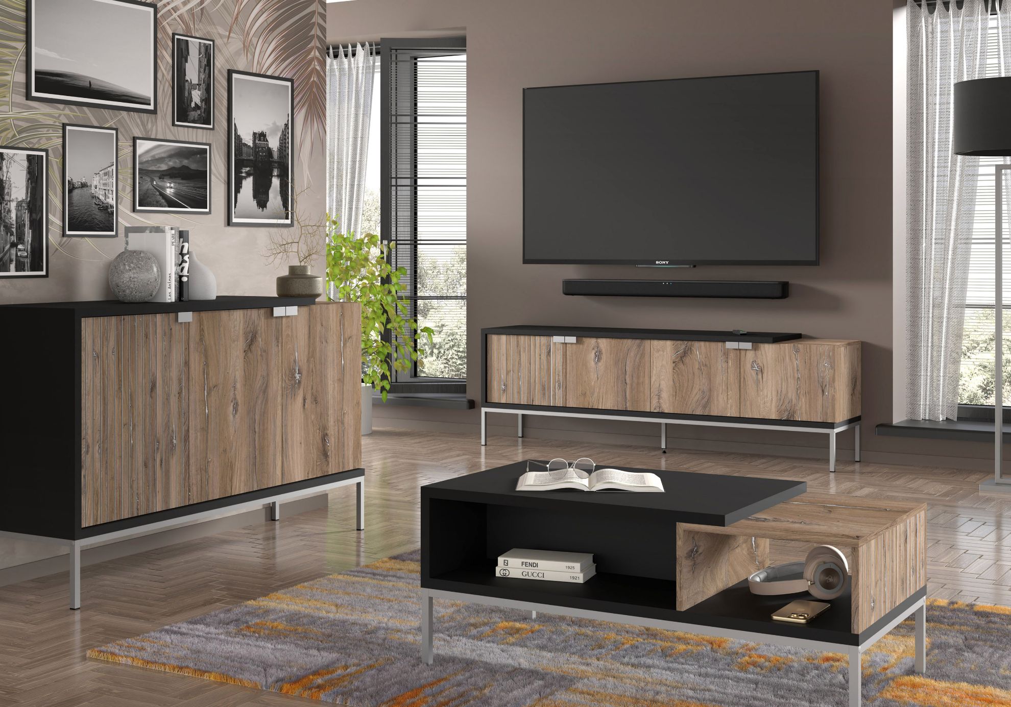 Komoda Eleonor w kolorze dębu Flagstaff z kolekcji Eleonor to połączenie elegancji, funkcjonalności i unikalnego designu, które sprawiają, że staje się ona wyjątkowym elementem aranżacji wnętrza. Jej rustykalny dekor imitujący postarzałe drewno doskonale współgra z kontrastującym odcieniem matowej czerni, a srebrne akcenty w postaci uchwytów i metalowej ramy dodają meblom wyrafinowanego charakteru.