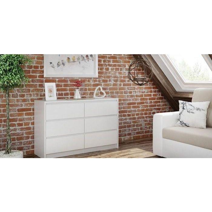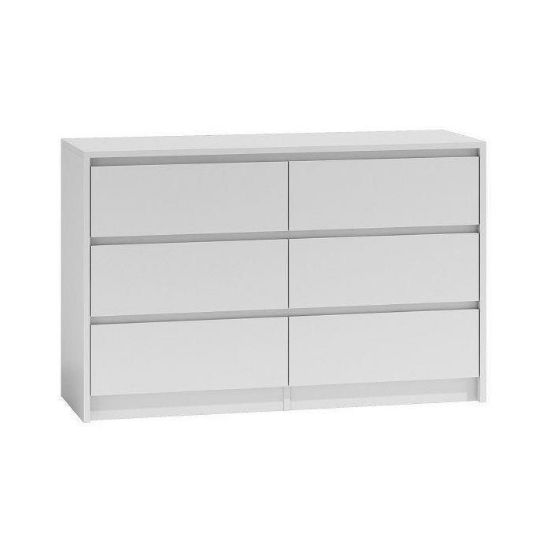 Biała komoda Elia to mebel idealny do pokoju dziennego, salonu lub sypialni. Wpasuje się w wiele aranżacji w nowoczesnych wnętrzach jak również we wnętrzach klasycznych. Szafka posiada szuflady do przechowywania odzieży lub innych przedmiotów. Szuflady bezuchwytowe wyposażone zostały w prowadnice rolkowe. Płyta laminowana o grubości 16mm to płyta, z której wykonano komodę. Do kompletu można dokupić inne meble z kolekcji.