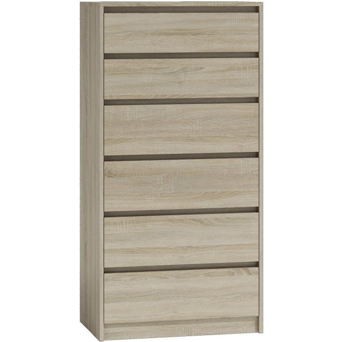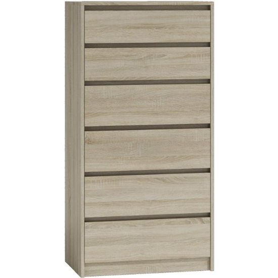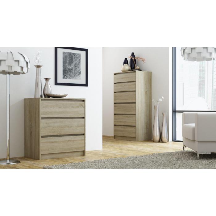 Komoda Elia to mebel idealny do pokoju dziennego, salonu lub sypialni. Kolor mebla dąb sonoma wpasuje się w wiele aranżacji w nowoczesnych wnętrzach jak również we wnętrzach klasycznych. Szafka posiada szuflady do przechowywania odzieży lub innych przedmiotów. Szuflady bezuchwytowe wyposażone zostały w prowadnice rolkowe. Płyta laminowana o grubości 16mm to płyta, z której wykonano komodę. Do kompletu można dokupić inne meble z kolekcji.