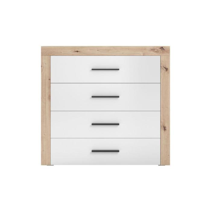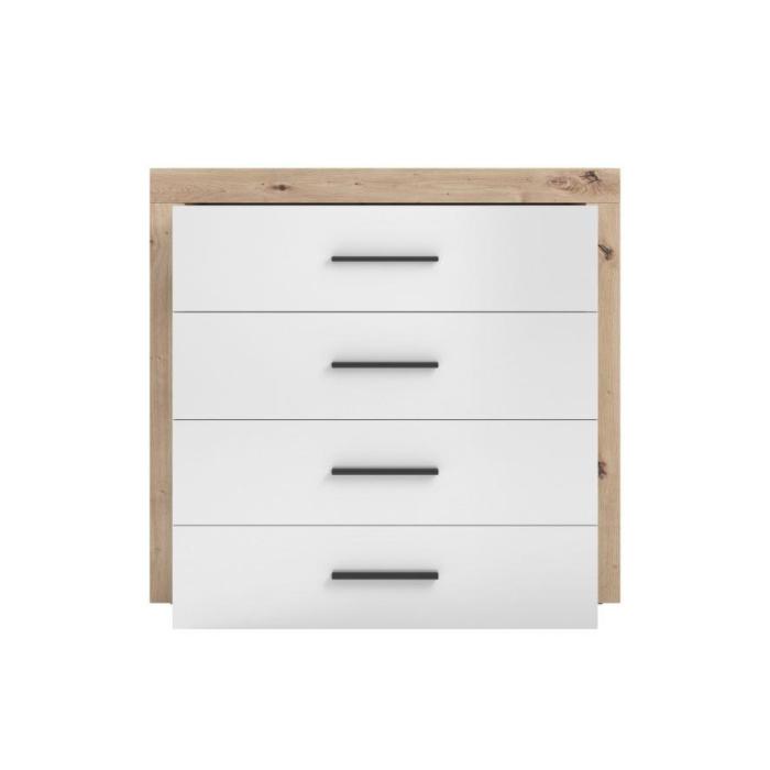 System Elso wykonany z płyty laminowanej w wybarwieniu dąb artisan z frontami w kolorze białym w połysku. Uchwyty wykonane z tworzywa w kolorze czarnym. W skład systemu wchodzą następujące bryły, komoda 2 drzwiowa 4 szuflady, szafka RTV, witryna wysoka, witryna niska, szafa dwudrzwiowa, półka, komoda 4 szuflady, szafa trzydrzwiowa z dwoma szufladami.