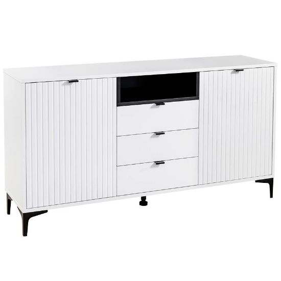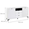 Fronty komody wykonane zostały z płyty MDF, co nadaje jej elegancki wygląd, a matowe wykończenie dodatkowo podkreśla nowoczesny charakter mebla. Korpus wykonano z płyty wiórowej laminowanej, co zapewnia trwałość oraz stabilność konstrukcji. Białe wybarwienie frontów i korpusu sprawia, że komoda wprowadza do wnętrza świeżość i optycznie powiększa przestrzeń, nadając jej lekkości i harmonii. Biały blat stanowi nie tylko praktyczne uzupełnienie, ale także świetne miejsce na wyeksponowanie dekoracji, takich jak ramki ze zdjęciami, rośliny czy inne ozdobne przedmioty.
