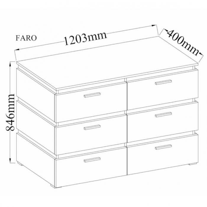 Komoda Faro to klasyczny mebel do pokoju dziennego lub sypialni. Wpasuje się w wiele aranżacji w nowoczesnych wnętrzach jak również we wnętrzach klasycznych. Kolekcja Faro wykonana została w kolorze dąb artisan, który imituje naturalny rysunek słojów. Aranżacje inspirowane drewnem nie tracą na popularności. Szafka posiada szuflady do przechowywania odzieży lub innych przedmiotów. Płyta laminowana to płyta, z której wykonano komodę.