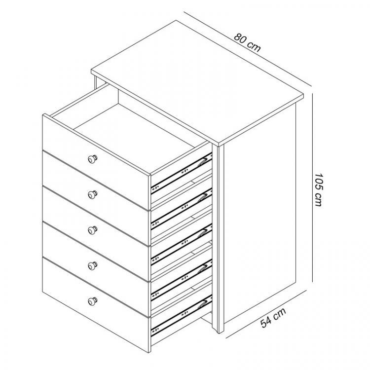 Komoda Finezja to elegancki i funkcjonalny mebel, który doskonale wpisze się w nowoczesne wnętrza. Jego wymiary (80 cm szerokości, 105 cm wysokości, 54 cm głębokości) pozwalają na wygodne przechowywanie różnorodnych rzeczy. Komoda posiada pięć przestronnych szuflad, co sprawia, że organizacja przestrzeni jest prosta i efektywna.