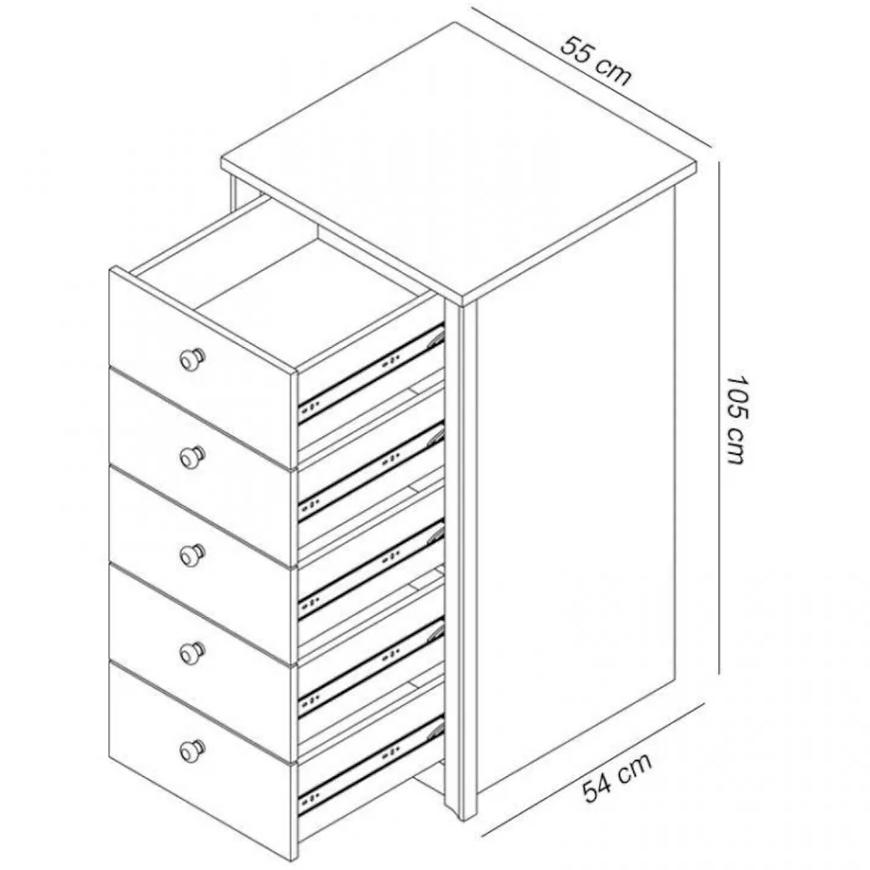 Komoda Finezja to elegancki i funkcjonalny mebel, który doskonale wpisze się w nowoczesne wnętrza. Jego wymiary (55 cm szerokości, 105 cm wysokości, 54 cm głębokości) pozwalają na wygodne przechowywanie różnorodnych rzeczy. Komoda posiada pięć przestronnych szuflad, co sprawia, że organizacja przestrzeni jest prosta i efektywna.