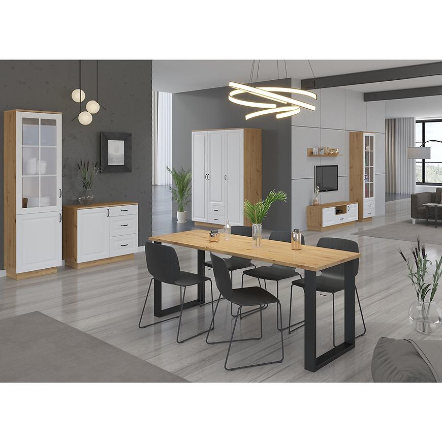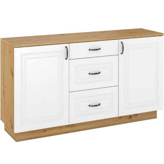 Za sprawą swojej imponującej szerokości 150 cm komoda Flawia zapewni mnóstwo miejsca do przechowywania. Dwudrzwiowe fronty umożliwiają łatwy dostęp do wnętrza, a trzy praktyczne szuflady gwarantują segregację i organizację różnorodnych przedmiotów. Komoda prezentuje się niezwykle harmonijnie dzięki stonowanemu białemu kolorowi frontów oraz korpusowi utrzymanemu w dębie artisan. Matowe wykończenie nadaje meblowi elegancji i wyjątkowego charakteru. Konstrukcja frontów z płyty MDF gwarantuje solidność, natomiast korpus z płyty wiórowej laminowanej jest odporny na uszkodzenia.