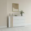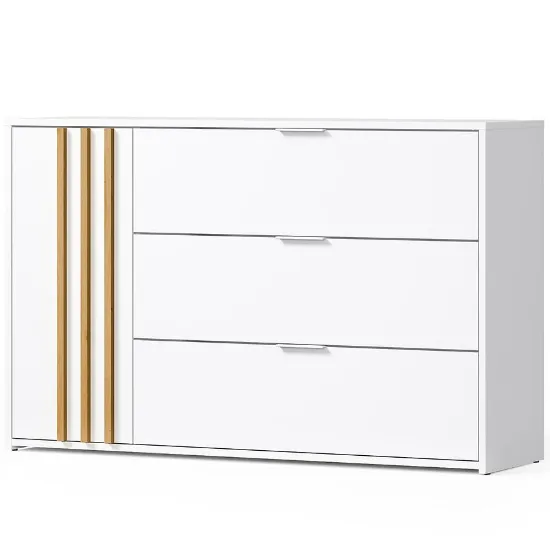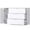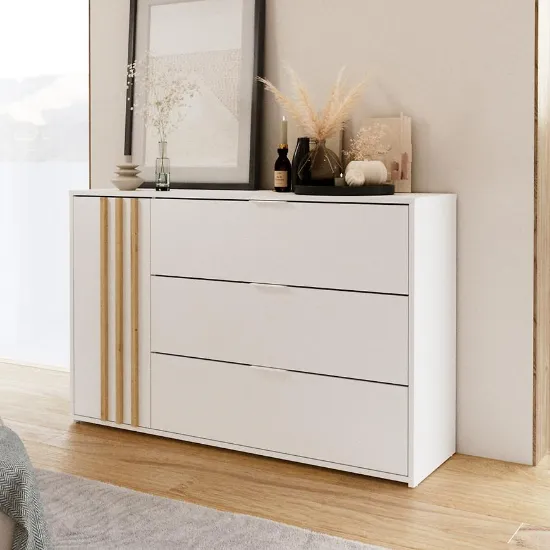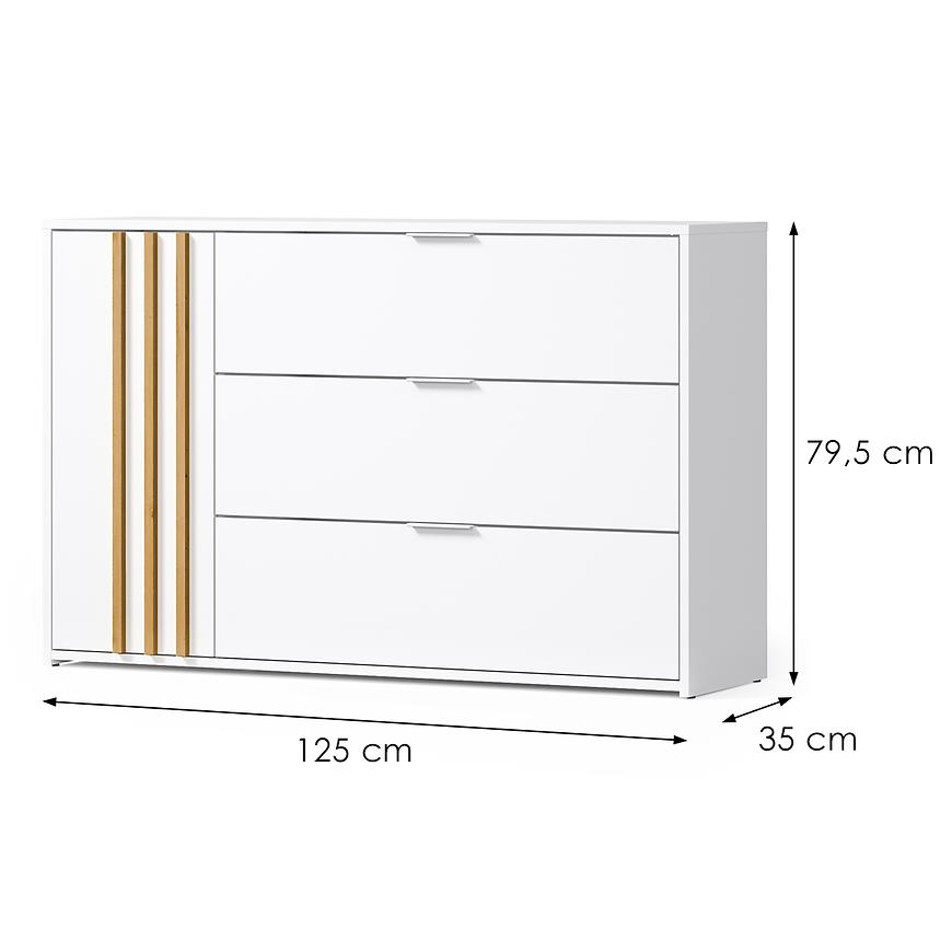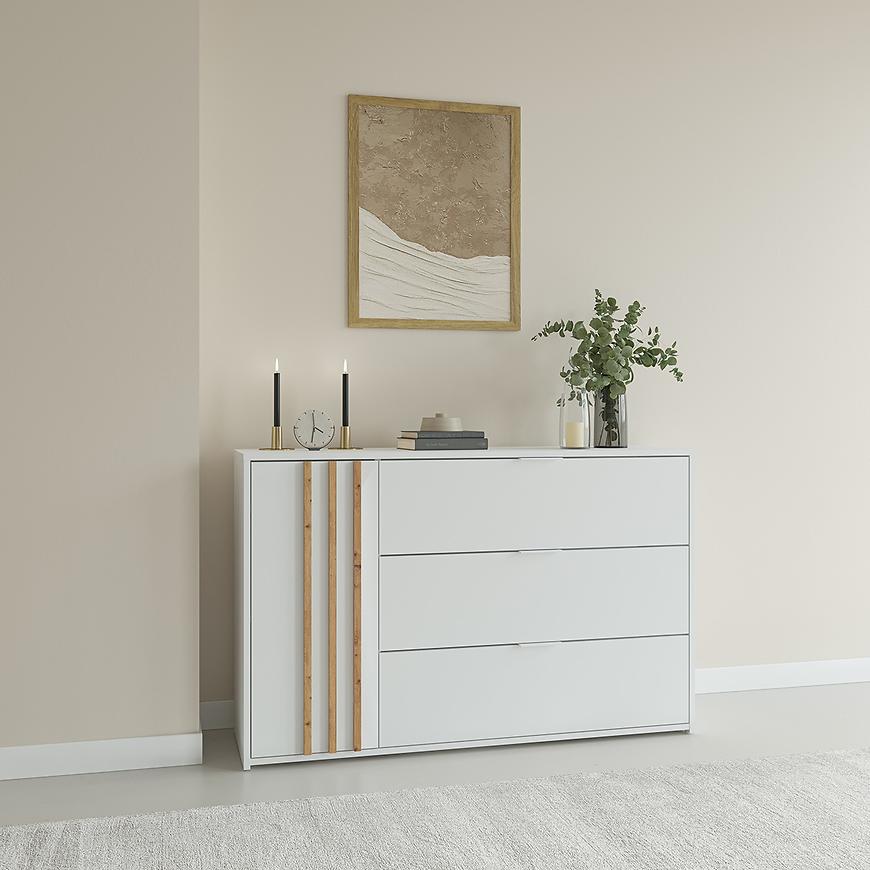 Komoda Florencja 1d3sz Biały/Dąb Artisan to elegancki mebel, który doskonale łączy klasyczną biel z ciepłym, naturalnym odcieniem dębu artisan. Dzięki tej ponadczasowej kolorystyce komoda wprowadza do wnętrza świeżość, lekkość i przytulny klimat, doskonale komponując się zarówno z nowoczesnymi, jak i klasycznymi aranżacjami.