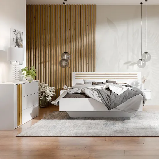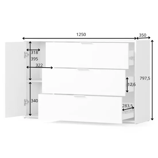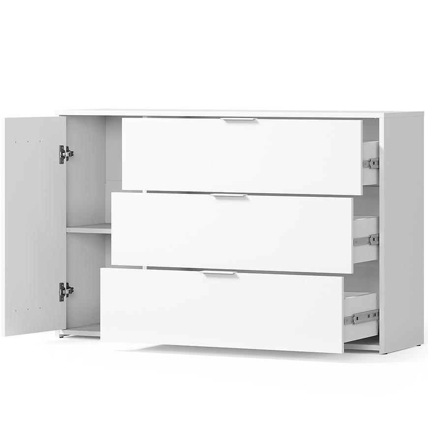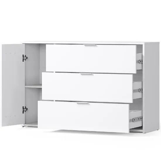 Model został wyposażony w trzy praktyczne szuflady oraz szafkę z frontem na zawiasach, co zapewnia wygodne i uporządkowane przechowywanie codziennych przedmiotów, ubrań czy dokumentów.