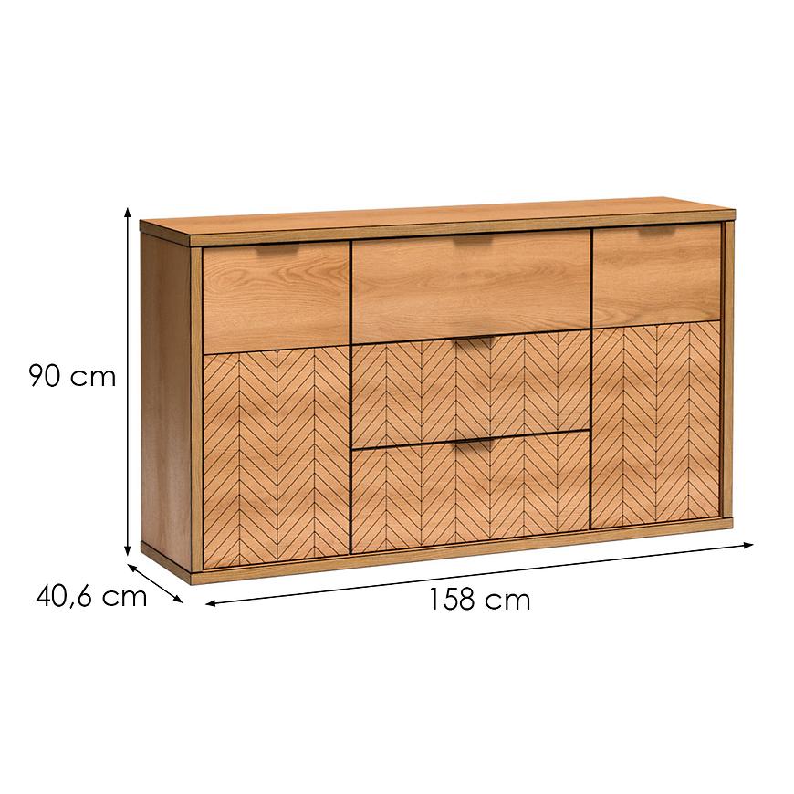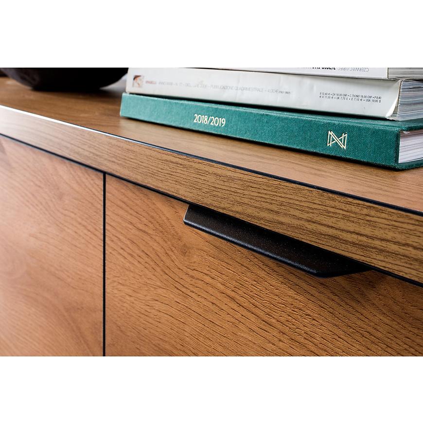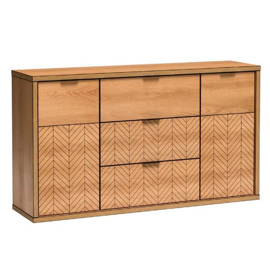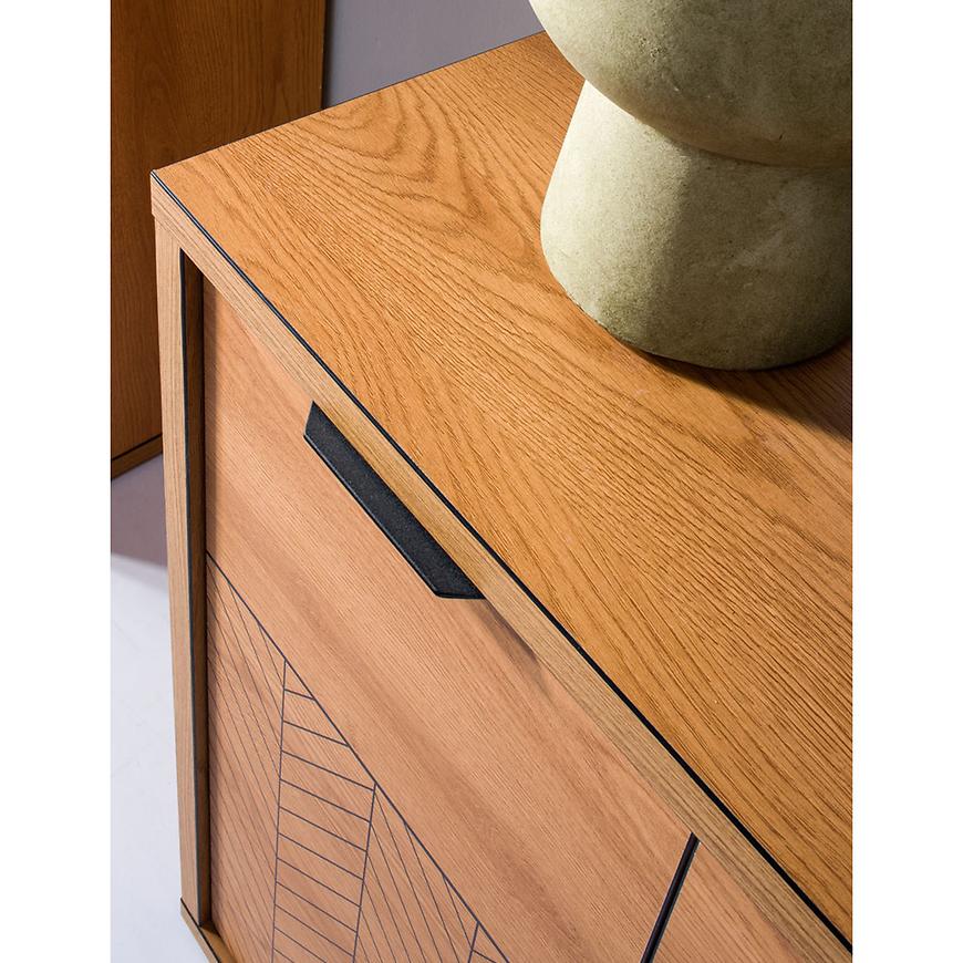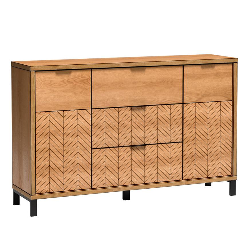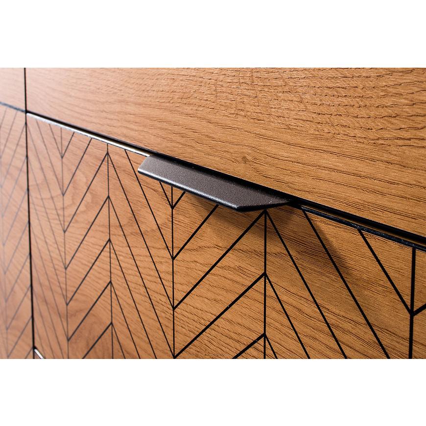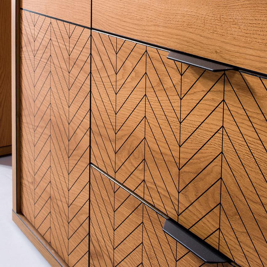 Kolor Dąb Karmel nadaje komodzie naturalnego piękna i ciepła. Jasne drewnopodobne wybarwienie wprowadza do przestrzeni przyjemną atmosferę, podkreślając jednocześnie nowoczesny design. Matowe wykończenie dodaje meblowi elegancji i subtelności, tworząc przyjemny efekt powierzchni matowej.