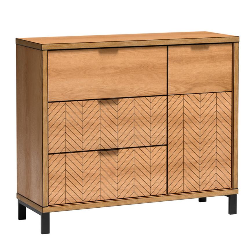 Kolor Dąb Karmel nadaje komodzie naturalnego piękna i ciepła. Jasne drewnopodobne wybarwienie wprowadza do przestrzeni przyjemną atmosferę, podkreślając jednocześnie nowoczesny design. Matowe wykończenie dodaje meblowi elegancji i subtelności, tworząc przyjemny efekt powierzchni matowej.