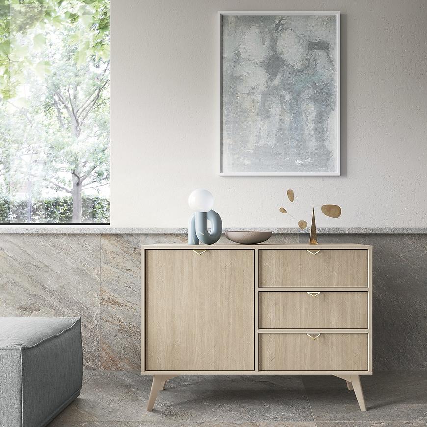 Fronty komody w odcieniu jodełki scandi wprowadzają do pomieszczenia atmosferę skandynawskiej prostoty i ciepła, idealnie komponując się z różnorodnymi stylami dekoracyjnymi. Wyrafinowany kolor korpusu, beż piaskowy, dodaje całości głębi i elegancji, tworząc spójny i przytulny charakter przestrzeni.