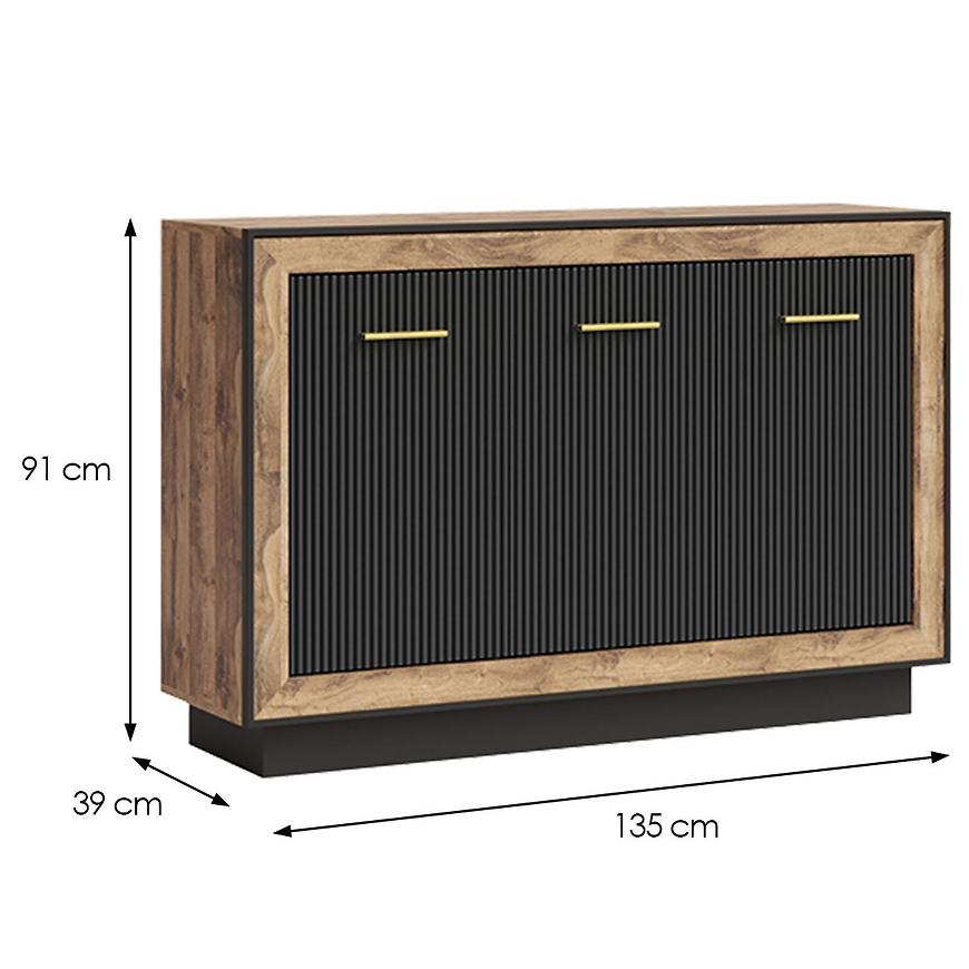 Wymiary komody to 91 cm wysokości, 135 cm szerokości i 60 cm głębokości, co sprawia, że jest to doskonałe rozwiązanie do przechowywania różnorodnych przedmiotów.