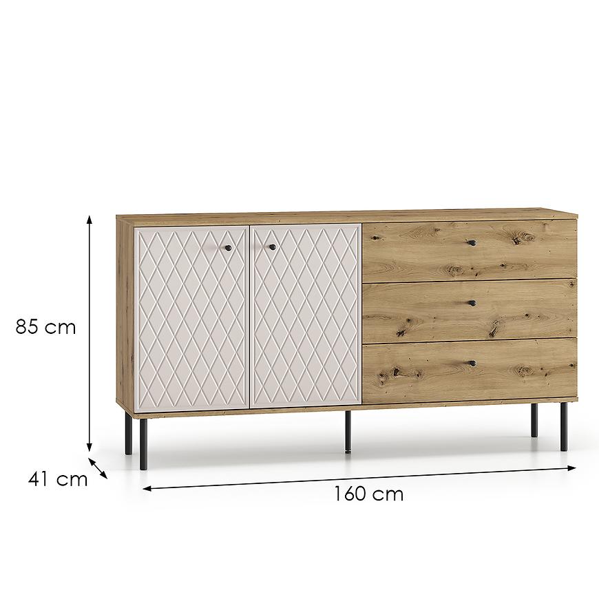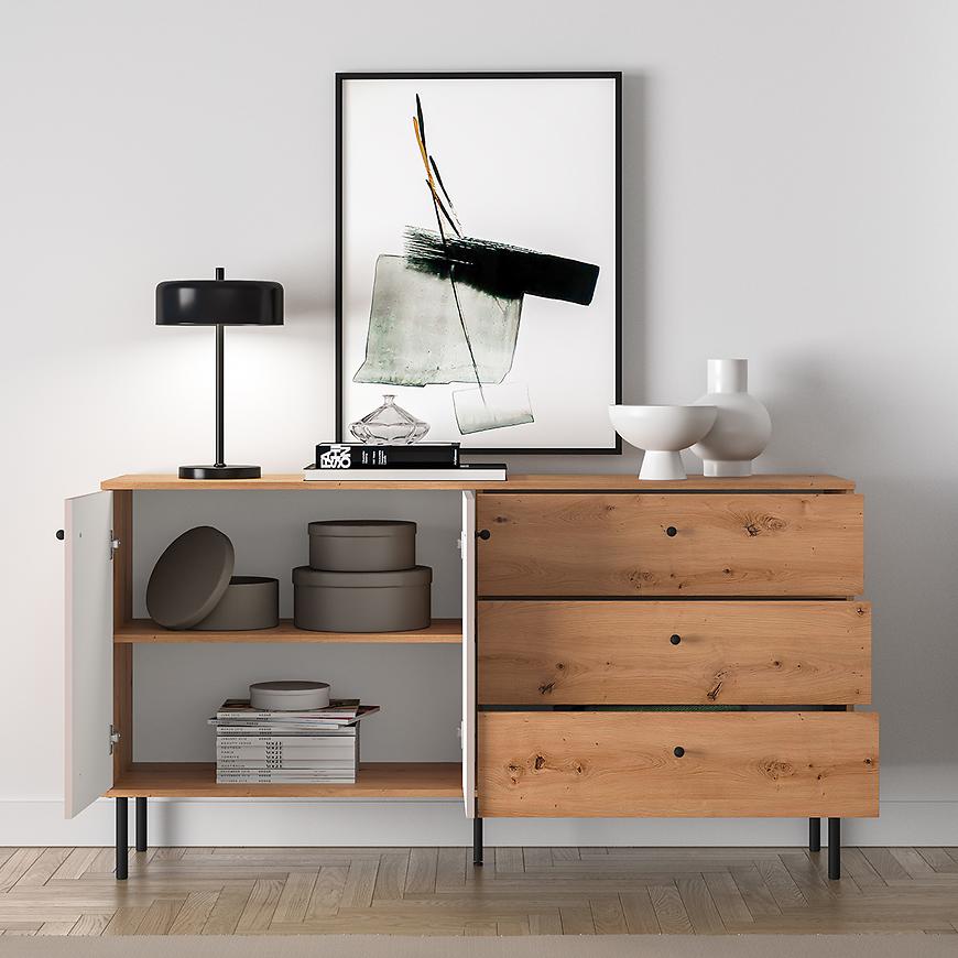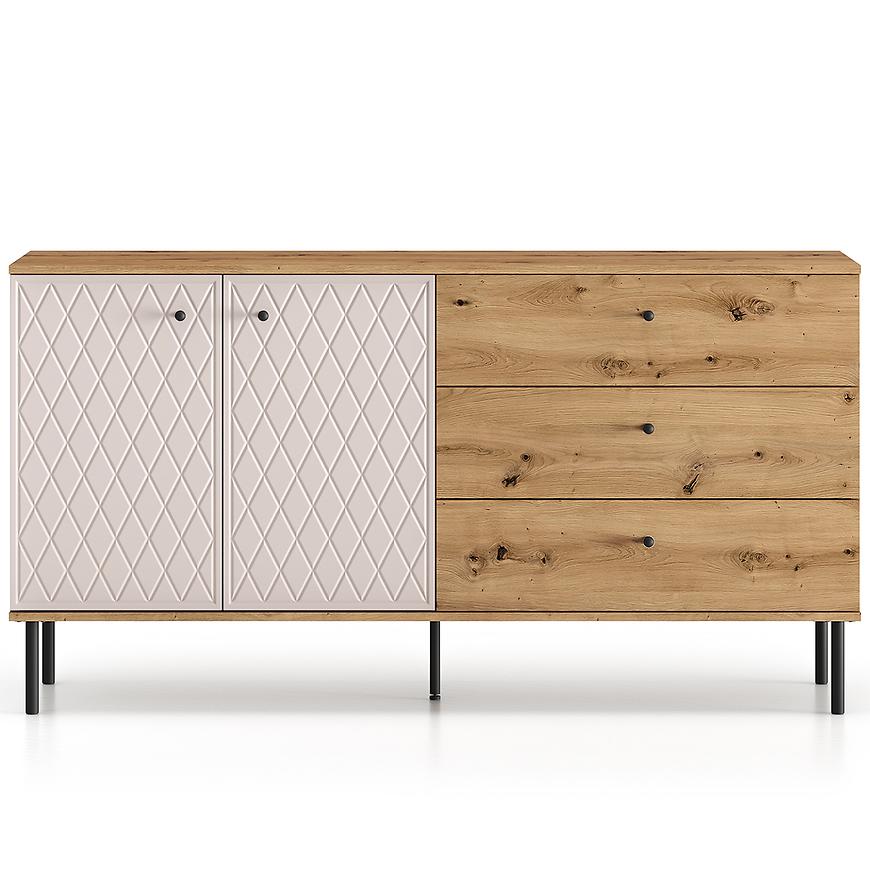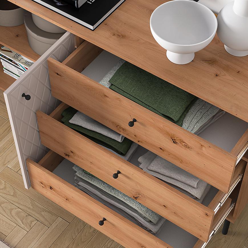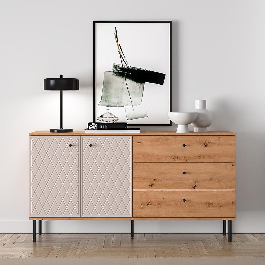 Fronty w modnym połączeniu kolorów dąb artisan i kaszmir tworzą elegancki, a jednocześnie ciepły akcent w aranżacji wnętrza. Korpus w kolorze dąb artisan podkreśla naturalny charakter mebla. Całość wykończona jest w matowym wykończeniu, co nadaje komodzie stonowaną, nowoczesną estetykę. Wykonana z trwałej płyty wiórowej laminowanej, komoda z kolekcji FREEDOM łączy w sobie solidność wykonania i ponadczasowy design.