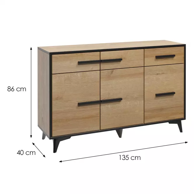 Komoda Frida II K3D3S to część kolekcji FRIDA II, która cechuje się industrialnym stylem i prostą, ale funkcjonalną formą. Dzięki swoim uniwersalnym rozmiarom komoda sprawdzi się zarówno w sypialni, jak i w salonie, czy przedpokoju, oferując nie tylko estetyczny, ale także praktyczny sposób na przechowywanie rzeczy. Drzwi i szuflady są pojemne, co sprawia, że bez trudu pomieszczą odzież, dokumenty, czy inne domowe przedmioty.