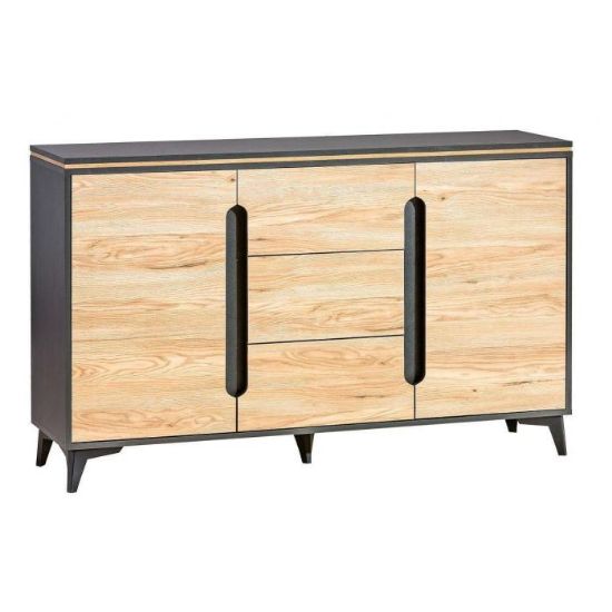 Komoda Gappa to klasyczny mebel do pokoju dziennego lub salonu. Ciekawa kolorystyka wpasuje się w wiele aranżacji w nowoczesnych wnętrzach jak również we wnętrzach klasycznych. Szafka posiada szuflady i drzwiczki dzięki czemu ma łatwy dostęp do wnętrza oraz odpowiednią przestrzeń do przechowywania odzieży lub innych przedmiotów. W meblach zastosowano system bezuchwytowy, a w szufladach prowadnice z domykiem. Płyta laminowana to płyta, z której wykonano komodę. Do kompletu można dokupić inne meble z kolekcji.