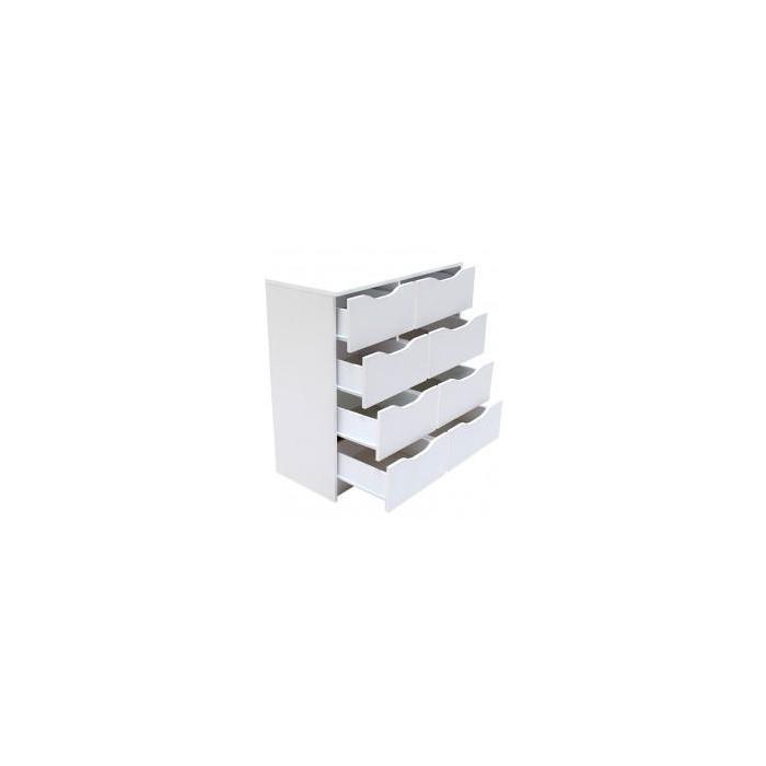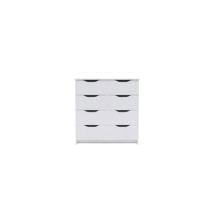 Biała komoda Gekon to klasyczny mebel do pokoju dziennego, salonu lub sypialni. Biały kolor wpasuje się w wiele aranżacji w nowoczesnych wnętrzach jak również we wnętrzach klasycznych. Szafka posiada szuflady do przechowywania odzieży lub innych przedmiotów. Komoda ma kompaktowe wymiary dzięki czemu można ją umieścić nawet w małym pomieszczeniu. Płyta laminowana to płyta, z której wykonano komodę.