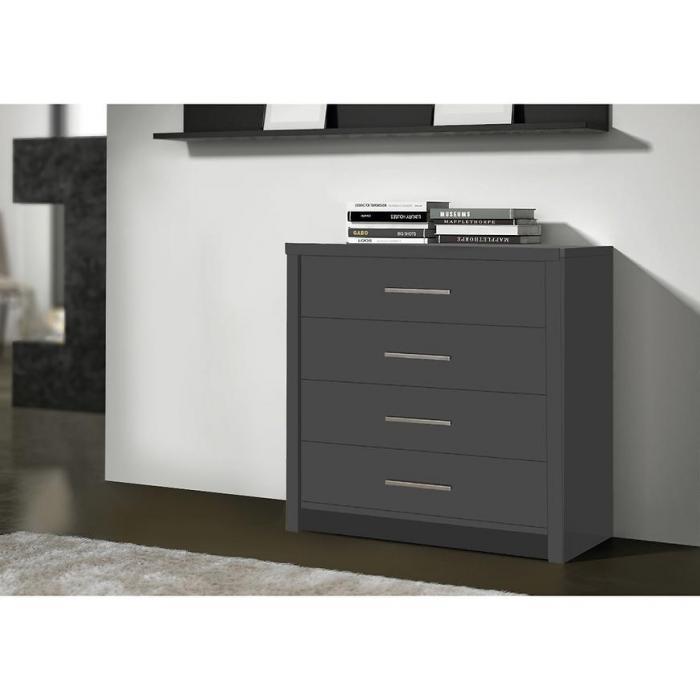 Komoda Genewa to klasyczny mebel do pokoju dziennego, salonu lub sypialni. Grafitowy kolor wpasuje się w wiele aranżacji w nowoczesnych wnętrzach jak również we wnętrzach klasycznych. Szafka posiada szuflady do przechowywania odzieży lub innych przedmiotów. Komoda posiada kompaktowe wymiary dzięki czemu można ją umieścić nawet w małym pomieszczeniu. Płyta meblowa to płyta, z której wykonano komodę.