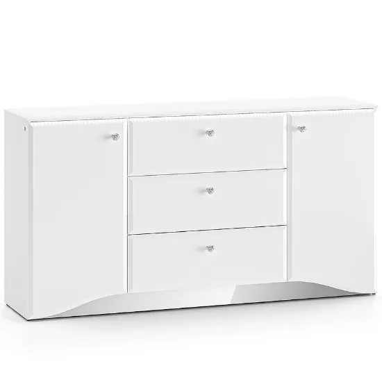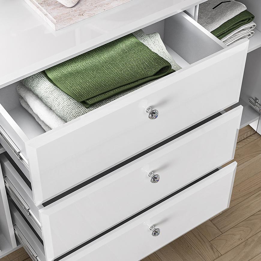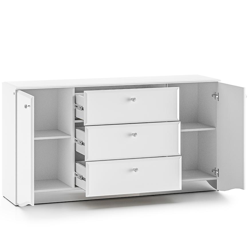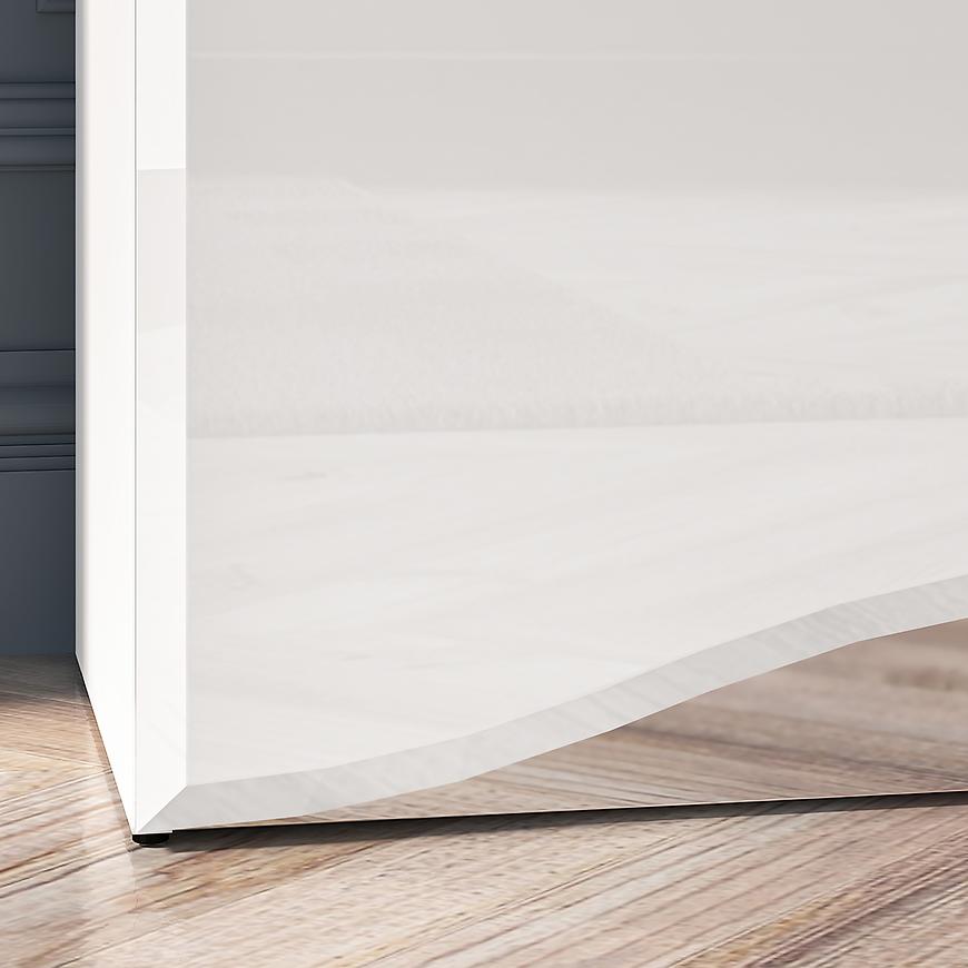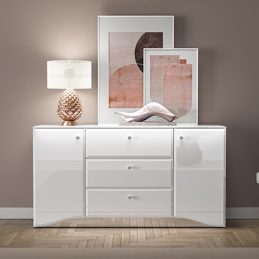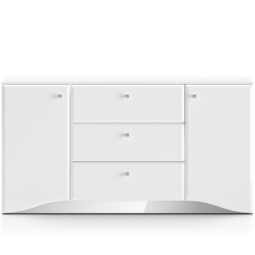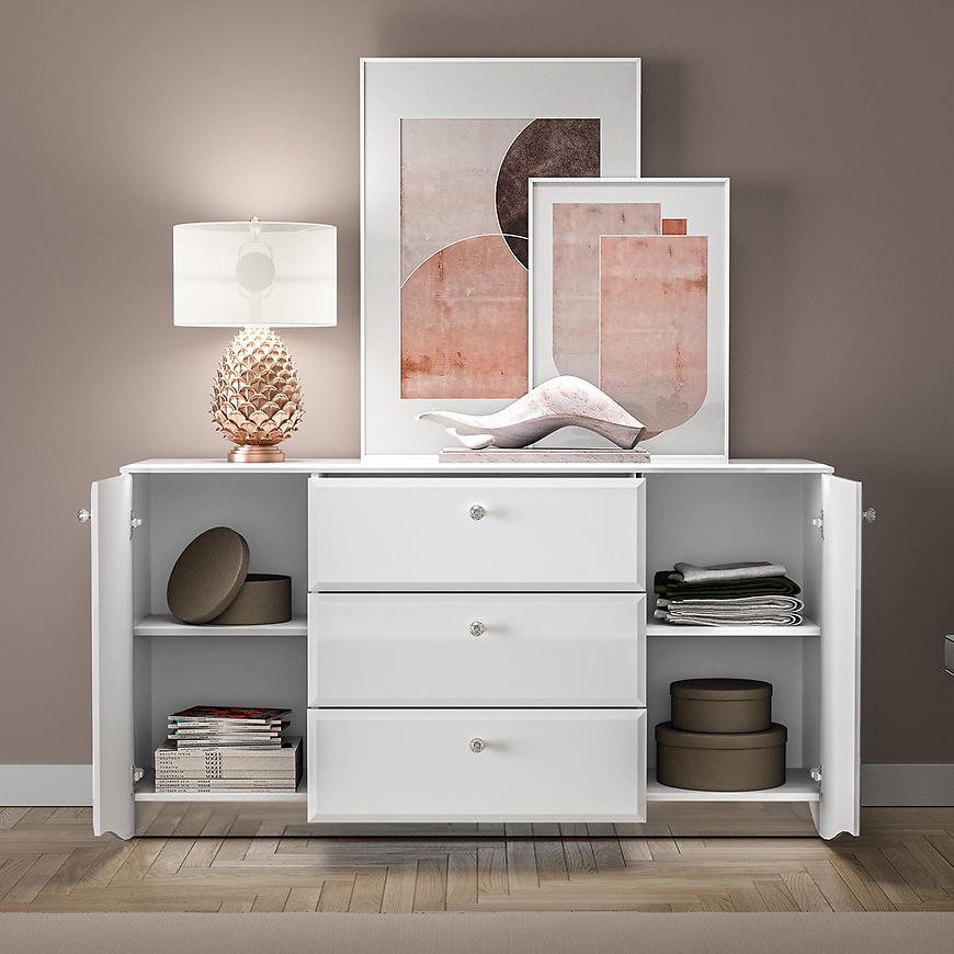 Komoda Glamour 02 Biały Połysk to elegancki mebel w nowoczesnym stylu, idealny do salonu, sypialni lub jadalni. Wyposażona w trzy praktyczne szuflady i dwudrzwiową szafkę, zapewnia funkcjonalną przestrzeń do przechowywania. Białe fronty z połyskiem wykonane z płyty MDF oraz błyszczący korpus tworzą spójną i stylową całość. Komoda z kolekcji GLAMOUR doskonale wpisuje się w jasne, nowoczesne wnętrza. Wymaga samodzielnego montażu.