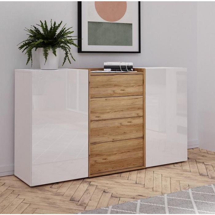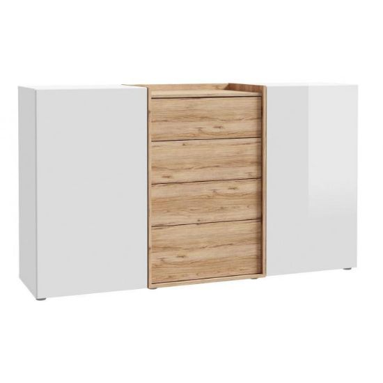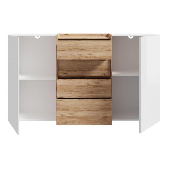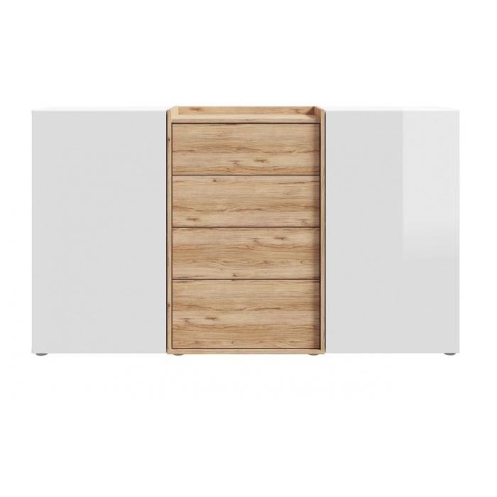 Komoda Golden Bay GLBK2311 wykonana w białym wybarwieniu w połączeniu z dekorem dąb catania. Na frontach i blatach zastosowano dekor biały połysk. W komodzie zastosowano system otwierania "Naciśnij aby otworzyć". Komoda posiada cztery szuflady oraz otwierane drzwiczki za którymi znajduje się dodatkowa półka. Maksymalne obciążenie szuflad wynosi 3 kg a półek 5 kg. Komoda wsparta jest na nóżkach typu "ślizgacz" w kolorze szary mat. Wymagany montaż do ściany komplet okuć w zestawie.