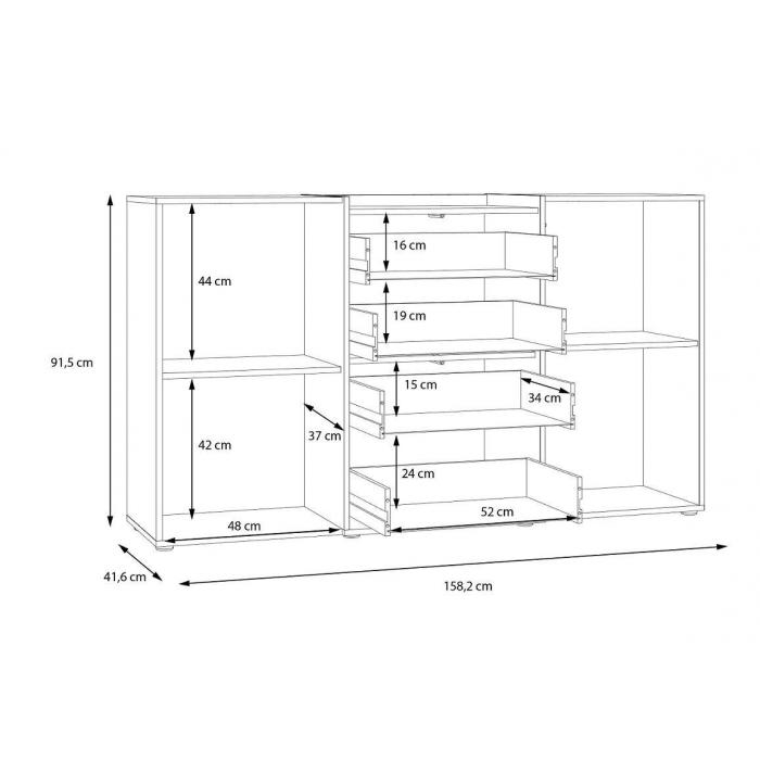 Komoda oferuje dużo miejsca min. do przechowywania odzieży. W czterech pojemnych szufladach wygodnie przechowasz bieliznę, dokumenty czy inne akcesoria. Za drzwiami szafki znajdziesz pojemne półki.