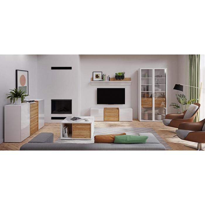 W ofercie dostępne są również pozostałe bryły systemy Golden Bay: witryna niska, witryna wysoka, szafka RTV pod telewizor, półka wisząca, stół rozkładany oraz stolik kawowy.
