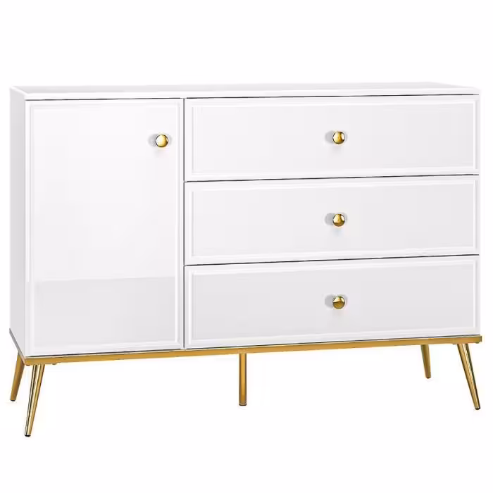Komoda Goldin w kolorze białym to przede wszystkim nowoczesność i funkcjonalność w jednym. Mebel doskonale sprawdzi się w każdym salonie. Materiał wykonania to płyta wiórowa laminowana. Komoda posiada trzy szuflady i jedną szafkę dzięki czemu ma łatwy dostęp do wnętrza. Wygląd mebli jest glamour. Mebel będzie pasował do wielu pomieszczeń jak np. jadalni czy pokoju dziennego. Meble jest bardzo pojemny, dlatego sprawdzi się w każdym pomieszczeniu - zarówno w sypialni, pokoju dziennym, młodzieżowym, czy też salonie. Mebel do samodzielnego montażu.
