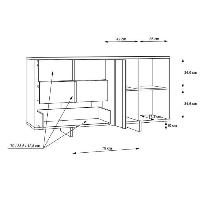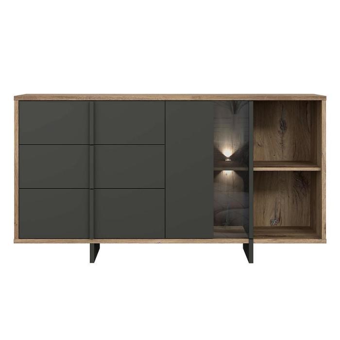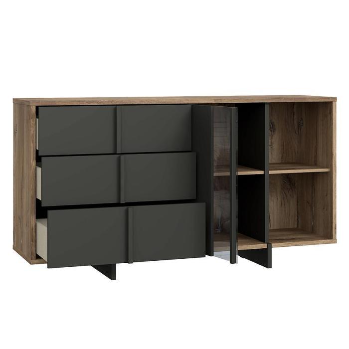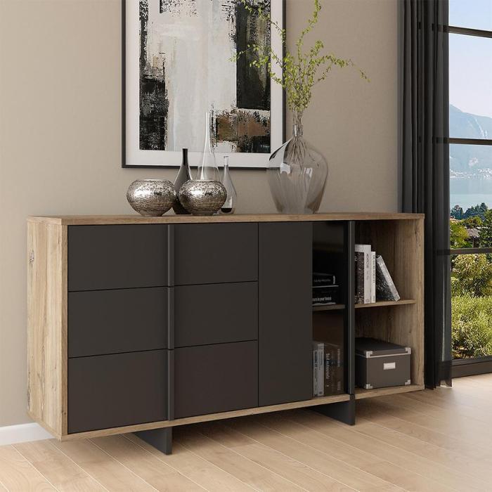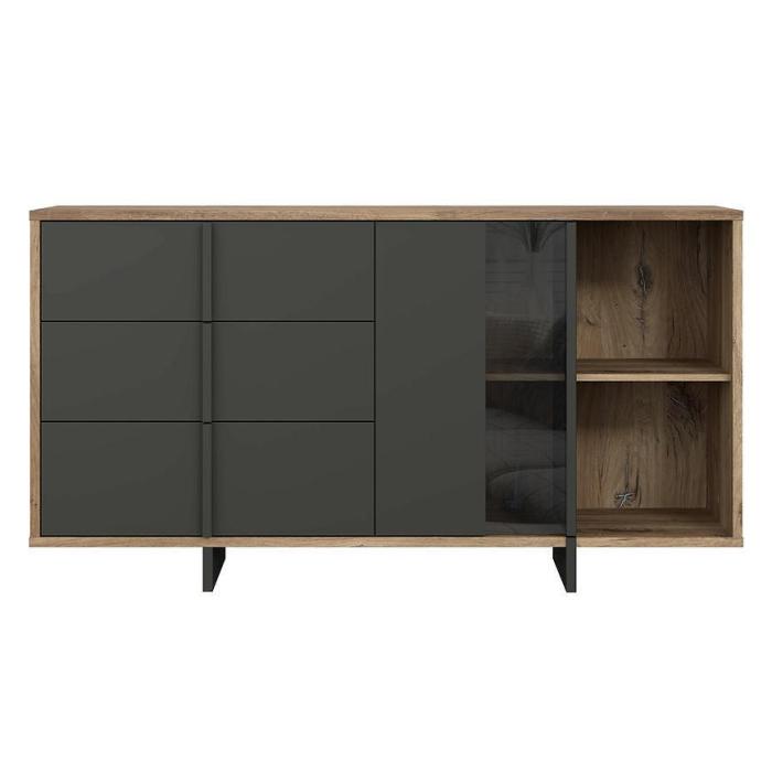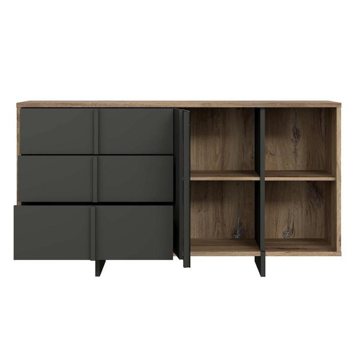Komoda Gudrid w kolorze dąb flagstaff/czarny to przede wszystkim nowoczesność i funkcjonalność w jednym. Mebel doskonale sprawdzi się w każdym salonie. Materiał wykonania to płyta wiórowa laminowana. Komoda posiada trzy szuflady oraz półki dzięki czemu ma łatwy dostęp do wnętrza. Wygląd mebli jest nowoczesny, a zarazem uniwersalny. Mebel będzie pasował do wielu pomieszczeń jak np. jadalni czy pokoju dziennego. Meble jest bardzo pojemny, dlatego sprawdzi się w każdym pomieszczeniu - zarówno w sypialni, pokoju dziennym, młodzieżowym, czy też salonie. Mebel do samodzielnego montażu.