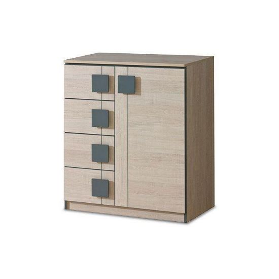 Komoda Gumi to mebel idealny do pokoju dziecięcego i młodzieżowego. Wpasuje się w wiele aranżacji w nowoczesnych wnętrzach jak również we wnętrzach klasycznych. Szafka posiada szuflady i drzwiczki dzięki czemu ma łatwy dostęp do wnętrza oraz odpowiednią przestrzeń do przechowywania odzieży oraz innych przedmiotów. Płyta laminowana to płyta, z której wykonano komodę. Do kompletu można dokupić inne meble z kolekcji.