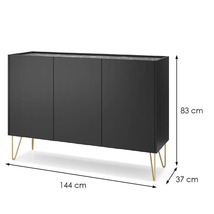Wykonana z wysokiej jakości płyty wiórowej laminowanej, komoda zapewnia trwałość i odporność na codzienne użytkowanie. Dzięki zastosowaniu matowego wykończenia, mebel ten prezentuje się niezwykle elegancko, a zarazem subtelnie podkreśla szlachetność materiału, z jakiego został wykonany. Ciemne odcienie czarnego grafitu w połączeniu z dekorem marmuru black na blacie, nadają komodzie wyjątkowej głębi i wyszukanego charakteru, który będzie pasował do wnętrz urządzonych zarówno w duchu nowoczesnym, jak i bardziej klasycznym. Model ten oferuje praktyczne rozwiązanie przechowywania dzięki trzydrzwiowej przestrzeni, za którą kryją się dodatkowe możliwości organizacji przestrzeni.
