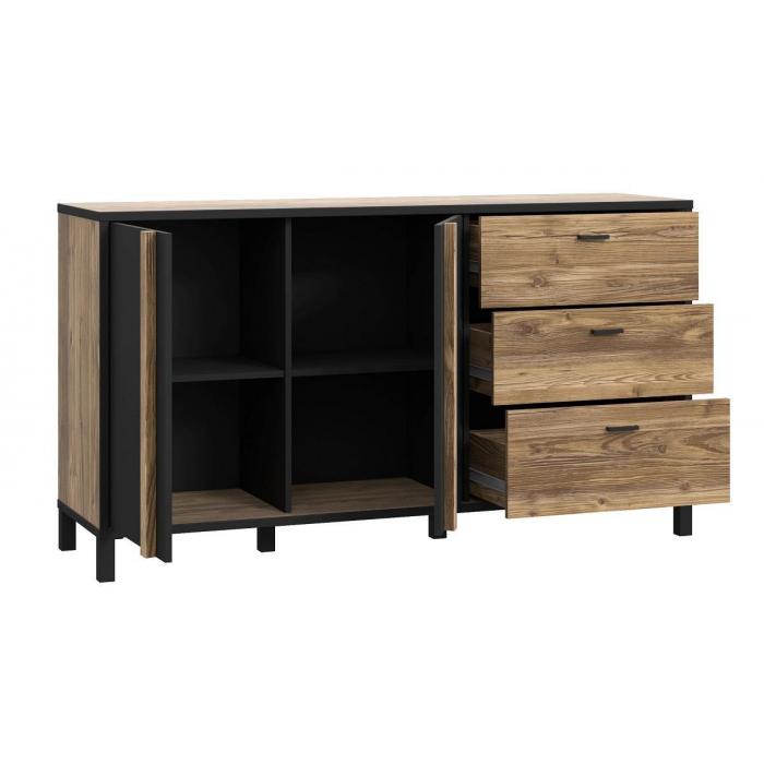 Komoda Hayato to mebel idealny do pokoju dziennego lub salonu. Wpasuje się w wiele aranżacji w nowoczesnych wnętrzach jak również we wnętrzach klasycznych. Kolekcja Hayato doskonale odnajdzie się w industrialnym lofcie. Szafka posiada szuflady i drzwiczki dzięki czemu ma łatwy dostęp do wnętrza oraz odpowiednią przestrzeń do przechowywania odzieży lub innych przedmiotów. Meble pozbawione są wymyślnych ozdobników. Jedynie długi pionowy uchwyt biegnący przez całą wysokość frontu jest elementem dekoracyjnym, a przy tym to bardzo praktyczne rozwiązanie, ponieważ możemy go chwycić w dowolnym miejscu. Do kompletu można dokupić inne meble z kolekcji.