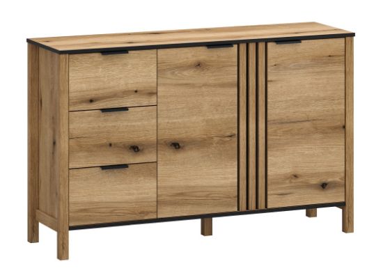 Czarne wykończenia blatu oraz metalowe uchwyty w kolorze czarnym nadają komodzie wyjątkowego, nowoczesnego charakteru. Komoda dwudrzwiowa z trzema szufladami to praktyczne rozwiązanie dla tych, którzy poszukują mebla, który połączy funkcję przechowywania z estetyką.