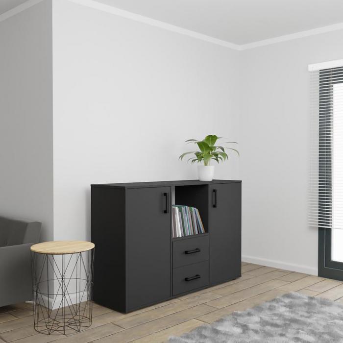 Komoda Herakles to niezbędny mebel w każdym domu. Praktyczna dzięki szafkom, szufladom i półce zadowoli każdego użytkownika. Uniwersalna kolorystyka sprawia, że będzie pasowała do wielu wnętrz. Idealny mebel do salonu, sypialni, pokoju dziennego lub innych pomieszczeń. Komoda dopełni również wystrój salonu, czy przedpokoju, stanowiąc wygodne miejsce do przechowywania mniejszych i większych rzeczy. Mebel do samodzielnego montażu.