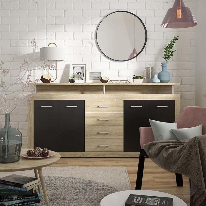 Komoda Hycoon to połączenie elegancji, stylu i funkcjonalności. Kolor mebla dąb sonoma/czarny wpasują się w wiele aranżacji w nowoczesnych wnętrzach jak również we wnętrzach klasycznych. Szafka posiada szuflady i drzwiczki dzięki czemu ma łatwy dostęp do wnętrza oraz odpowiednią przestrzeń do przechowywania odzieży lub innych przedmiotów. Płyta laminowana to płyta, z której wykonano komodę.