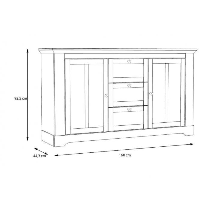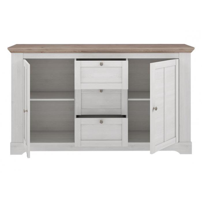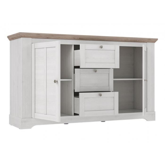 Stylizowana komoda w stylu prowansalskim wprowadzi romantyczny klimat w salonie czy jadalni. Niepowtarzalny charakter nadają meblu bogate zdobienia: ramkowe fronty, finezyjnie wyfrezowany wieniec górny czy masywny cokół. Komoda łączy w sobie duet drewnianych dekorów: jasny Dąb Śnieżny, z którego wykonany jest korpus mebla oraz kontrastowy Dąb Nelson (wieniec górny).