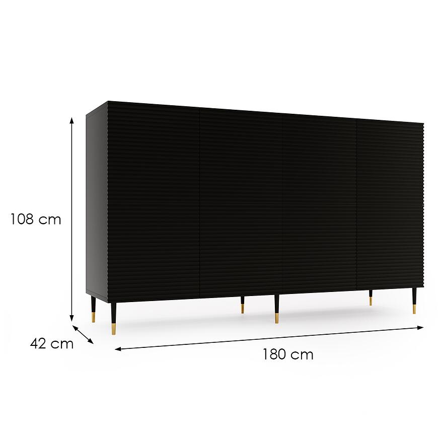 Komoda ma szerokość 180 centymetrów, wysokość 108 centymetrów i głębokość 42 centymetry. Kilkudrzwiowa konstrukcja pozwala wygodnie przechowywać różne przedmioty, a brak szuflad umożliwia pełne wykorzystanie przestrzeni wewnętrznej. Dzięki temu mebel jest praktyczny i funkcjonalny w codziennym użytkowaniu, zachowując przy tym nowoczesny i elegancki wygląd.