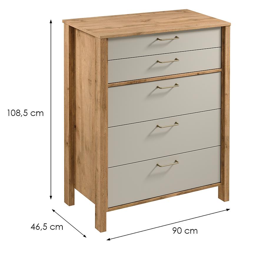 Wykonana z wysokiej jakości płyty wiórowej laminowanej, komoda charakteryzuje się trwałością oraz odpornością na uszkodzenia. Jasne drewnopodobne wybarwienie korpusu w odcieniu dębu wotan w połączeniu z matowym wykończeniem frontów w kolorze beżowym nadaje całości elegancki i stylowy wygląd. Taki zestaw kolorystyczny sprawia, że mebel harmonijnie wpisuje się w różnorodne aranżacje, dodając im subtelnego ciepła i przytulności.