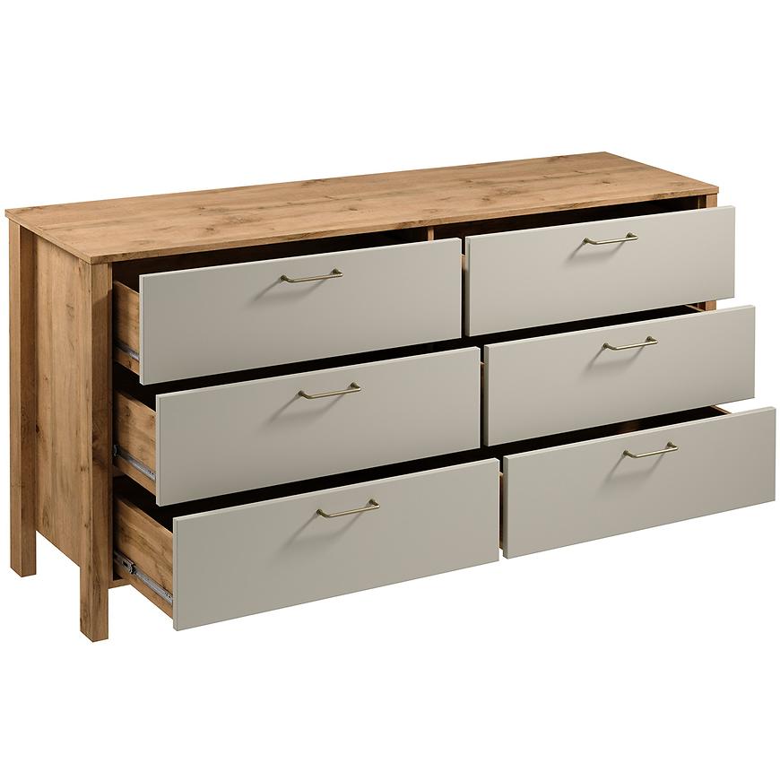 Komoda Indygo K6S to elegancki i funkcjonalny mebel, który doskonale wpisuje się w nowoczesne trendy aranżacyjne. Jej imponujące wymiary wynoszące 170,5 cm szerokości, 81 cm wysokości oraz 46,5 cm głębokości sprawiają, że staje się centralnym punktem każdego pomieszczenia, zapewniając jednocześnie dużo miejsca do przechowywania. Z sześcioma praktycznymi szufladami, komoda oferuje wiele możliwości organizacji przestrzeni, umożliwiając łatwy dostęp do najpotrzebniejszych przedmiotów.