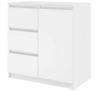 Doskonałym wyborem do pokoju dziennego będzie komoda w kolorze białym, materiał wykonania to płyta wiórowa laminowana. Komoda posiada trzy szuflady, na prowadnicach rolkowych oraz jedną szafkę dzięki czemu ma łatwy dostęp do wnętrza. Komoda dopełni również wystrój salonu, czy przedpokoju, stanowiąc wygodne miejsce do przechowywania mniejszych i większych rzeczy. Mebel do samodzielnego montażu.