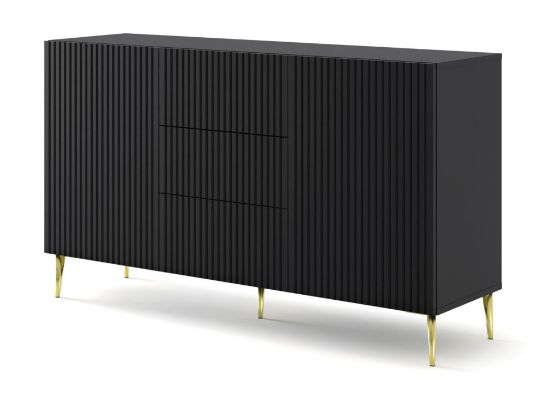 Korpus komody wykonany jest z trwałej płyty laminowanej, co zapewnia nie tylko solidną konstrukcję, ale także łatwe utrzymanie czystości. Fronty z płyty MDF pokrytej frezem i folią prezentują się niezwykle stylowo, dodając komodzie wyjątkowego charakteru. Czarny mat korpusu doskonale kontrastuje z frezem na frontach, nadając meblowi świeżości i nowoczesności.