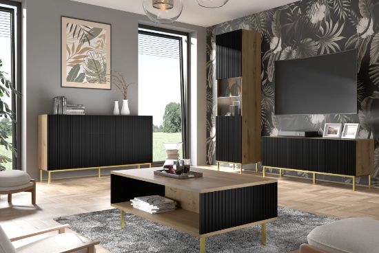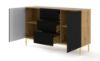 Korpus komody wykonany jest z trwałej płyty laminowanej, co zapewnia nie tylko solidną konstrukcję, ale także łatwe utrzymanie czystości. Fronty z płyty MDF pokrytej frezem i folią prezentują się niezwykle stylowo, dodając komodzie wyjątkowego charakteru. Dąb artisan mat korpusu doskonale kontrastuje z frezem na frontach, nadając meblowi świeżości i nowoczesności.