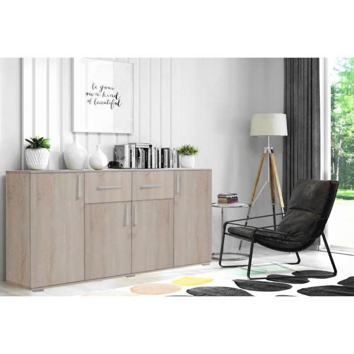 Doskonałym wyborem do pokoju dziennego będzie komoda w kolorze dąb sonoma z serii Jacob, materiał wykonania to płyta laminowana. Komoda posiada drzwiczki oraz szuflady, dzięki czemu ma łatwy dostęp do wnętrza. Komoda dopełni również wystrój salonu, czy przedpokoju, stanowiąc wygodne miejsce do przechowywania mniejszych i większych rzeczy. Mebel do samodzielnego montażu.